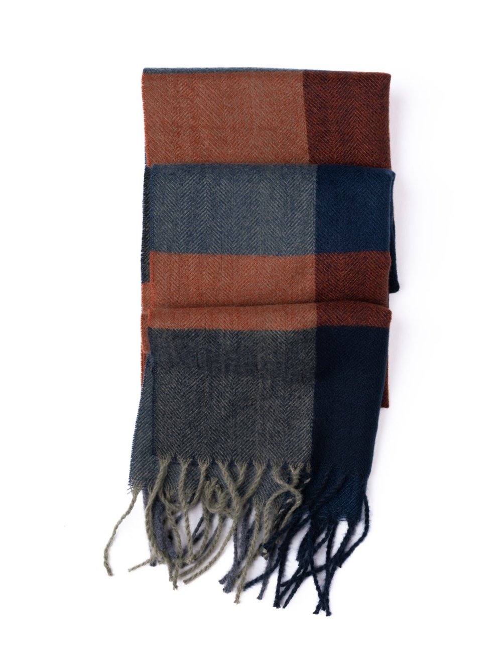 Bufanda de hombre con maxi estampado de madrás y flecos confeccionada en cálido tejido de espiga hilado a mano.