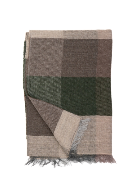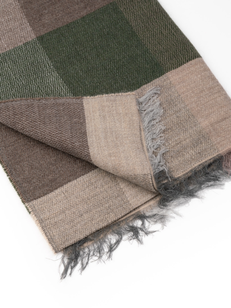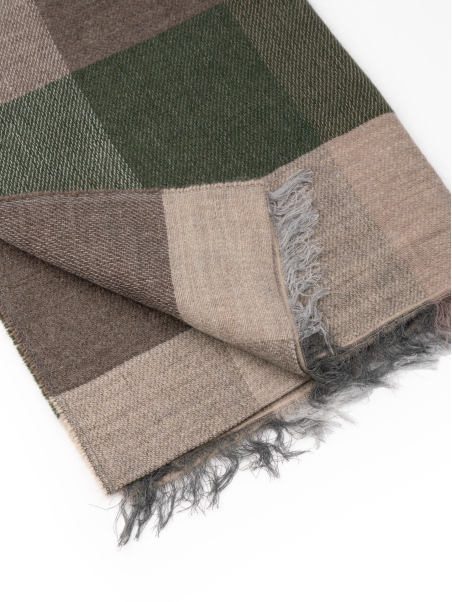 Bufanda de hombre en tejido jacquard ligero de mezcla de lana, caracterizada por un diseño de cuadros tricolor. Propuesta en tres combinaciones: arena-verde-militar-azul, verde-militar-arena-tortura y galleta-havoy-cry.
