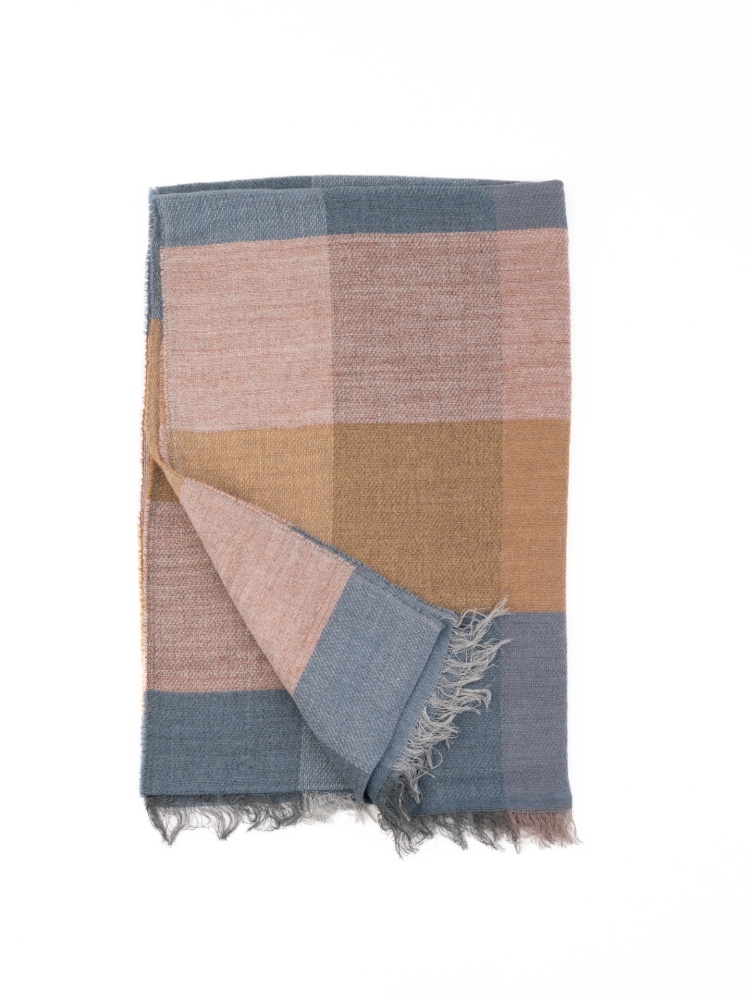 Bufanda de hombre en tejido jacquard ligero de mezcla de lana, caracterizada por un diseño de cuadros tricolor. Propuesta en tres combinaciones: arena-verde-militar-azul, verde-militar-arena-tortura y galleta-havoy-cry.