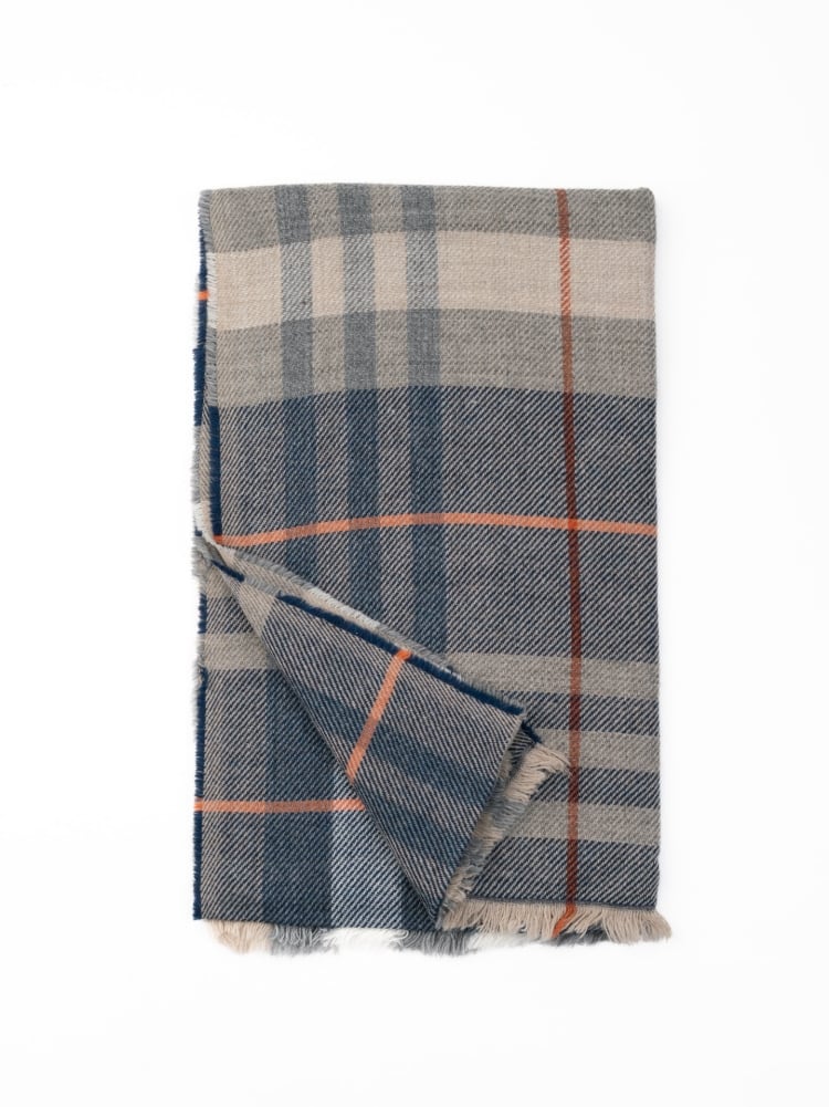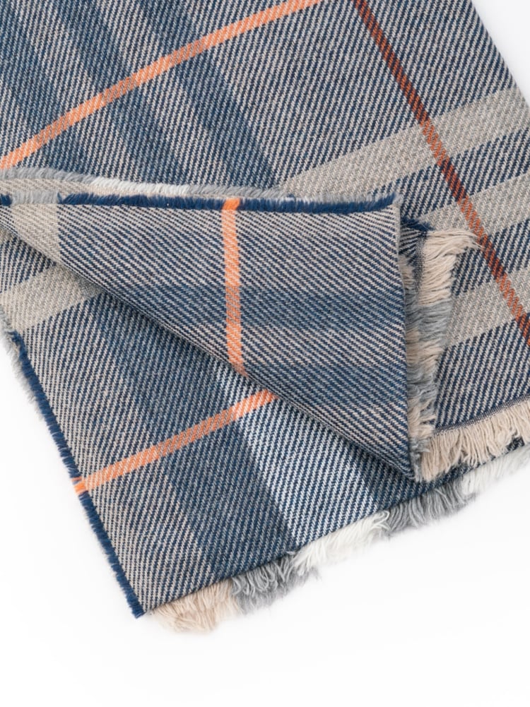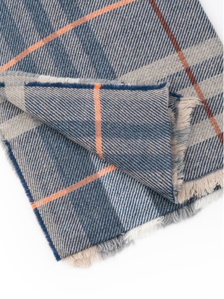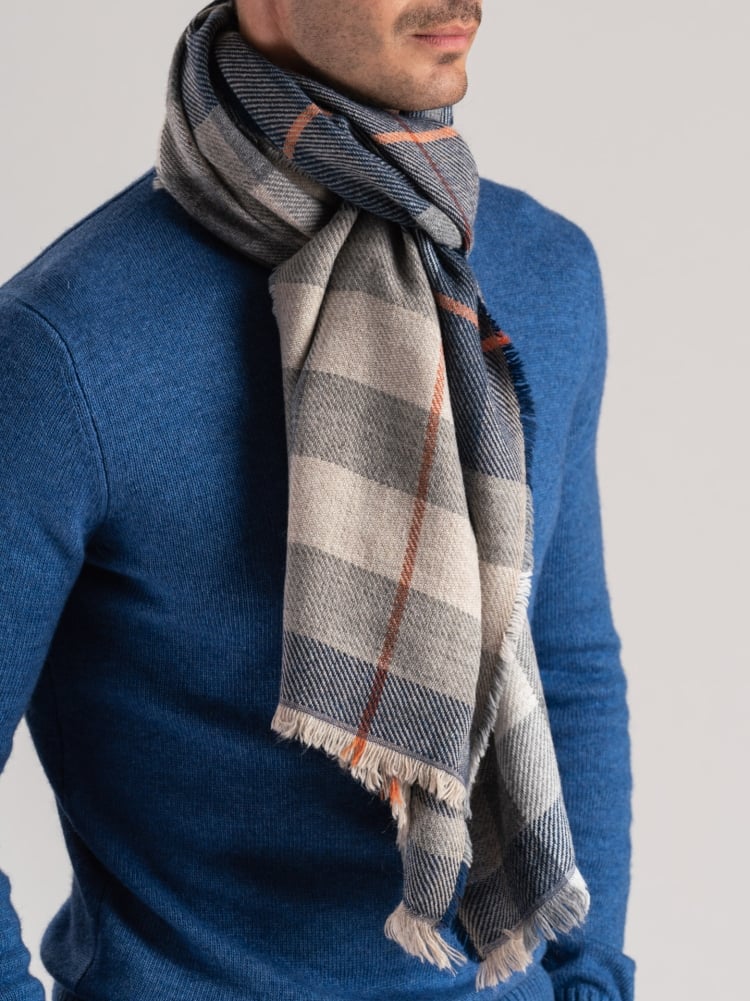 Bufanda de hombre en tejido diagonal de mezcla de lana y estampado macro madrás en tonos grises, crema y azul. El acabado ligeramente deshilachado añade un suave detalle a los bordes. Un accesorio cálido y versátil, diseñado para completar looks informales e invernales con un atrevido estampado gráfico.