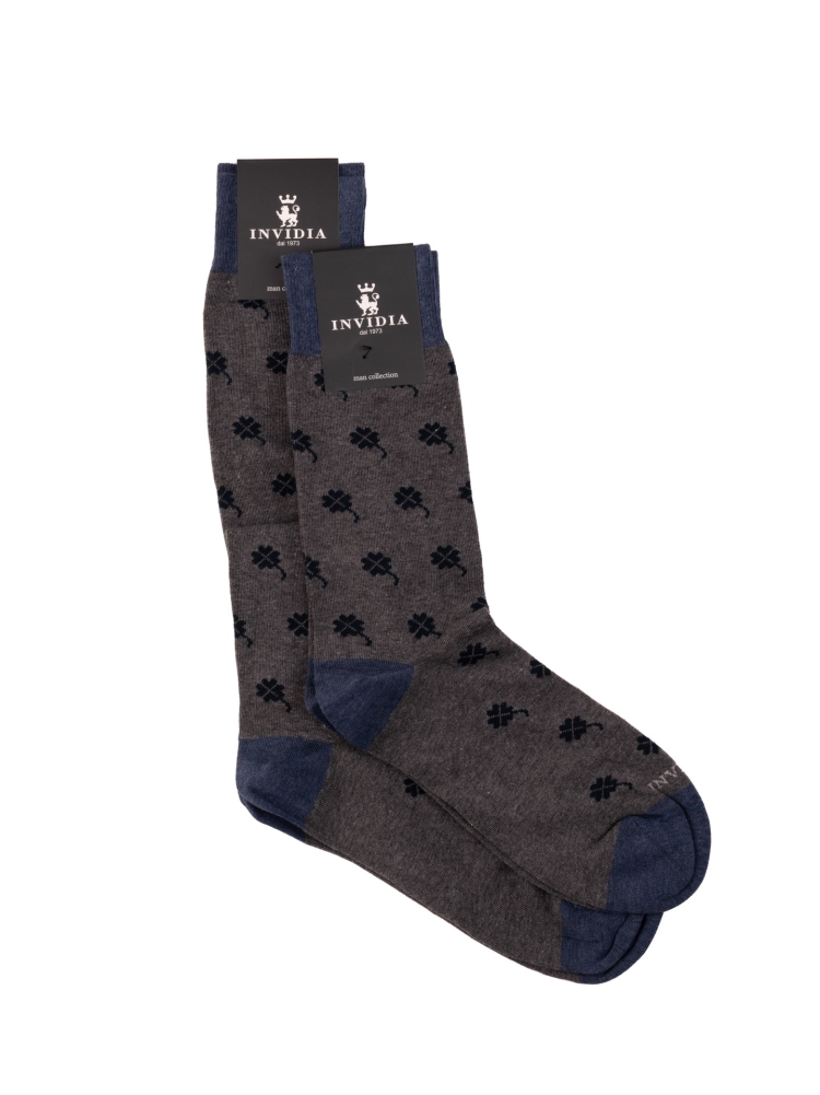 Calcetines con estampado de trébol sobre una base azul o gris, con detalles de contraste en marfil o gris paloma.