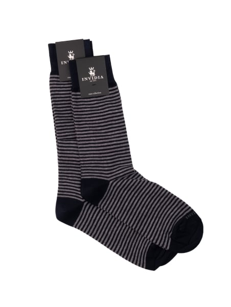 Calcetines de hombre con un diseño de rayas uniformes en tonos azules sobre una base gris. El volante, el talón y la puntera contrastados en azul crean un efecto coordinado y discreto. Disponibles en versión larga y corta, están confeccionados en hilo suave y elástico para mayor comodidad y resistencia. Un modelo clásico revisitado con equilibrio cromático.