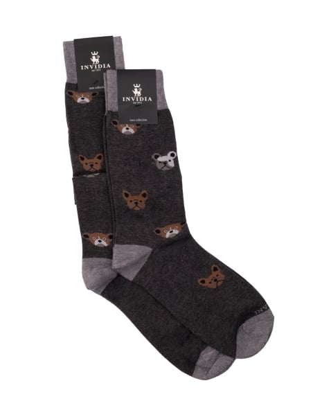 Calcetines de hombre con estampado de perritos, que se ofrecen en dos variantes: una base azul melange con volante, talón y puntera en gris tórtola en contraste, o una base gris oscuro con detalles en gris claro en contraste. Disponibles en versión larga y corta, están confeccionados en hilo suave y elástico para combinar comodidad, resistencia y originalidad.