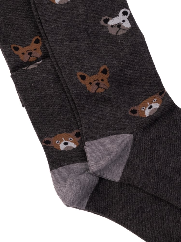 Calcetines con estampado de perros sobre una base azul melange o gris oscuro, detalles en contraste en gris tórtola o gris claro.