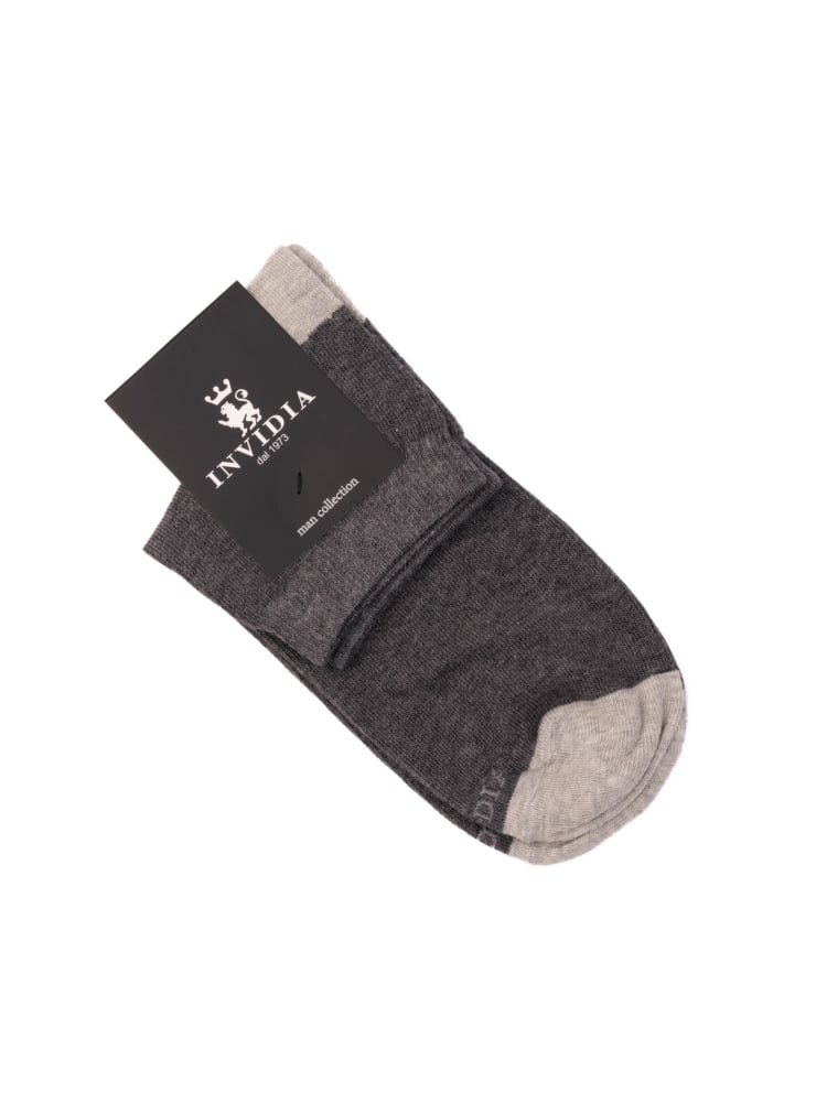 Calcetines tobilleros de hombre, longitud justo por encima del tobillo. Propuestos en tres variantes: azul con talón y puntera aviación, gris con talón y puntera crema, marrón con talón y puntera azul. Confeccionados en hilo suave y elástico, garantizan la comodidad diaria y una excelente vestibilidad, con un toque de color en contraste.