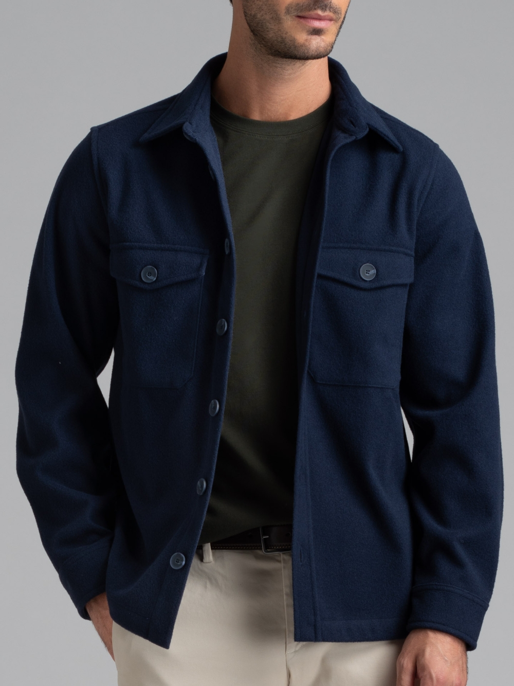 Sobrecamisa de paño para hombre caracterizada por bolsillos altos de parche con solapa, cierre de botones y canesú interior forrado en tejido tono sobre tono. Esta sobrecamisa está disponible en azul y camel.