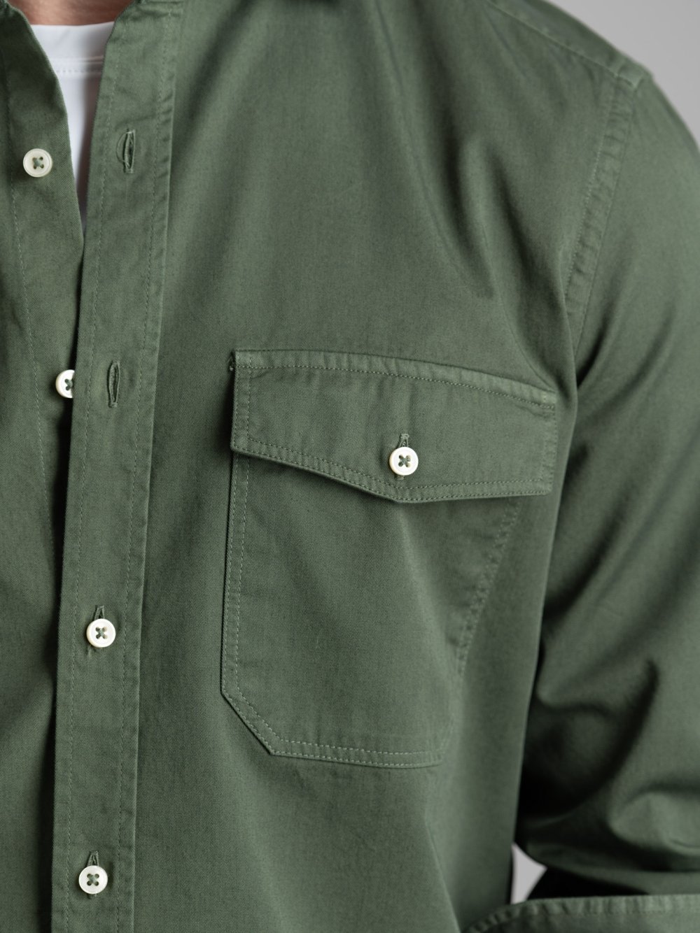 Camisa entallada de hombre en tejido de sarga de algodón teñido en prenda con bolsillos de parche y corte entallado.