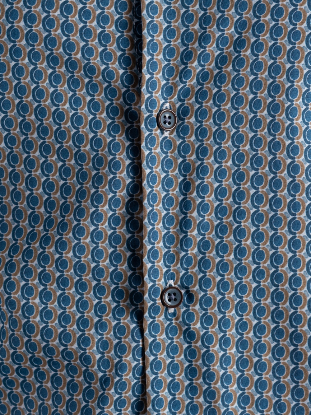 Camisa de caballero en popelín de algodón estampado con diseño geométrico en tonos azul, marfil y marrón oscuro. Medio cuello con inserción en tejido Príncipe de Gales marrón oscuro. El canolo está enriquecido con una cinta multicolor en contraste, mientras que los botones bicolores azul oscuro recuerdan los colores del estampado.