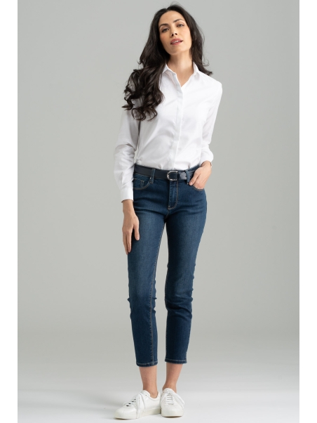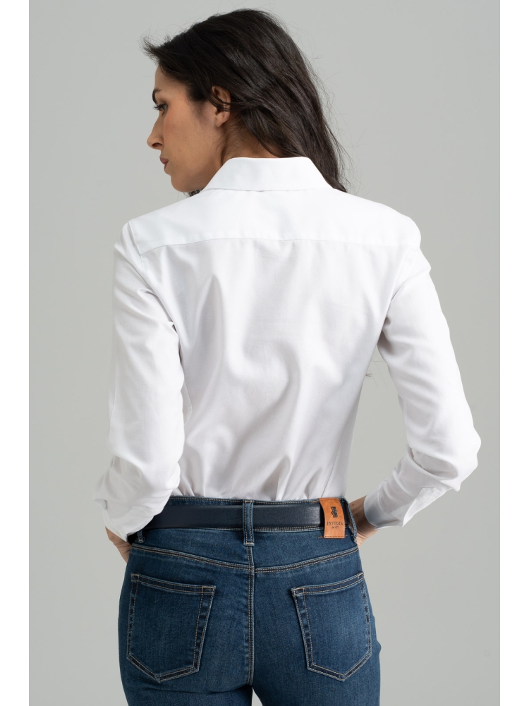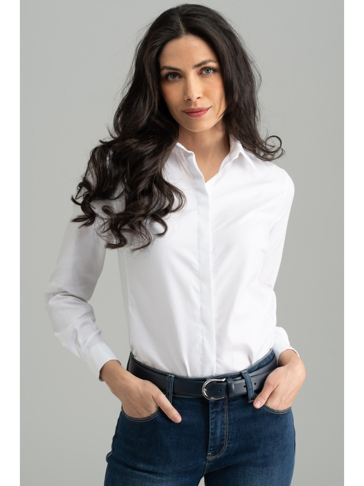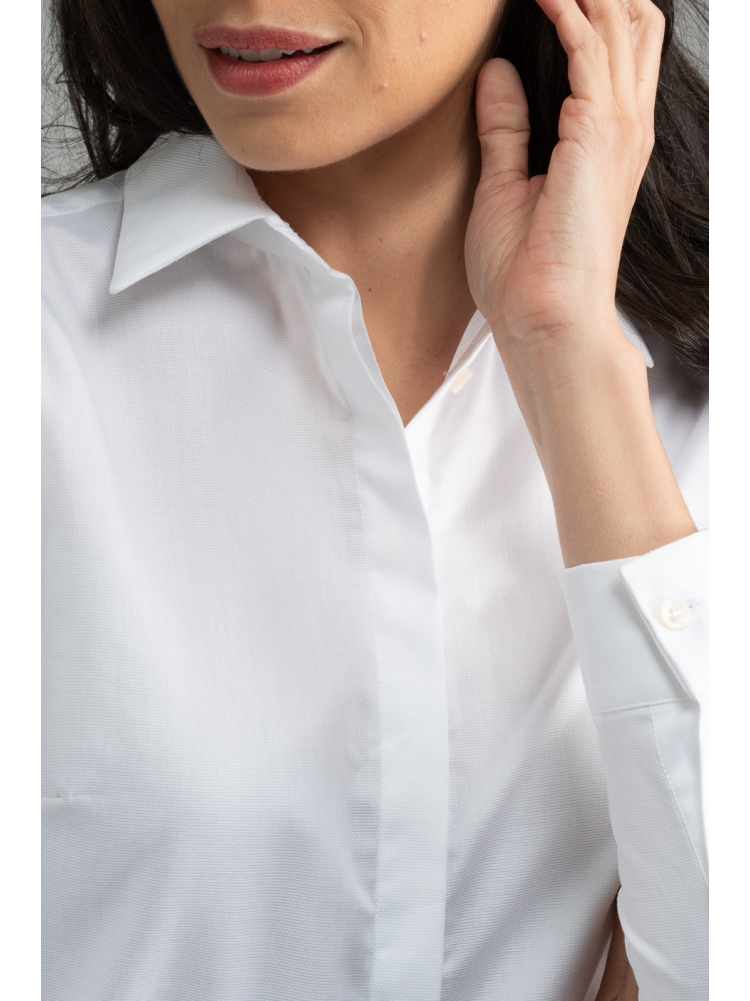 Camisa de mujer de corte clásico en color liso con pinzas y tapeta de botones frontal con abotonado oculto. Confeccionada en tejido de microtejido blanco.