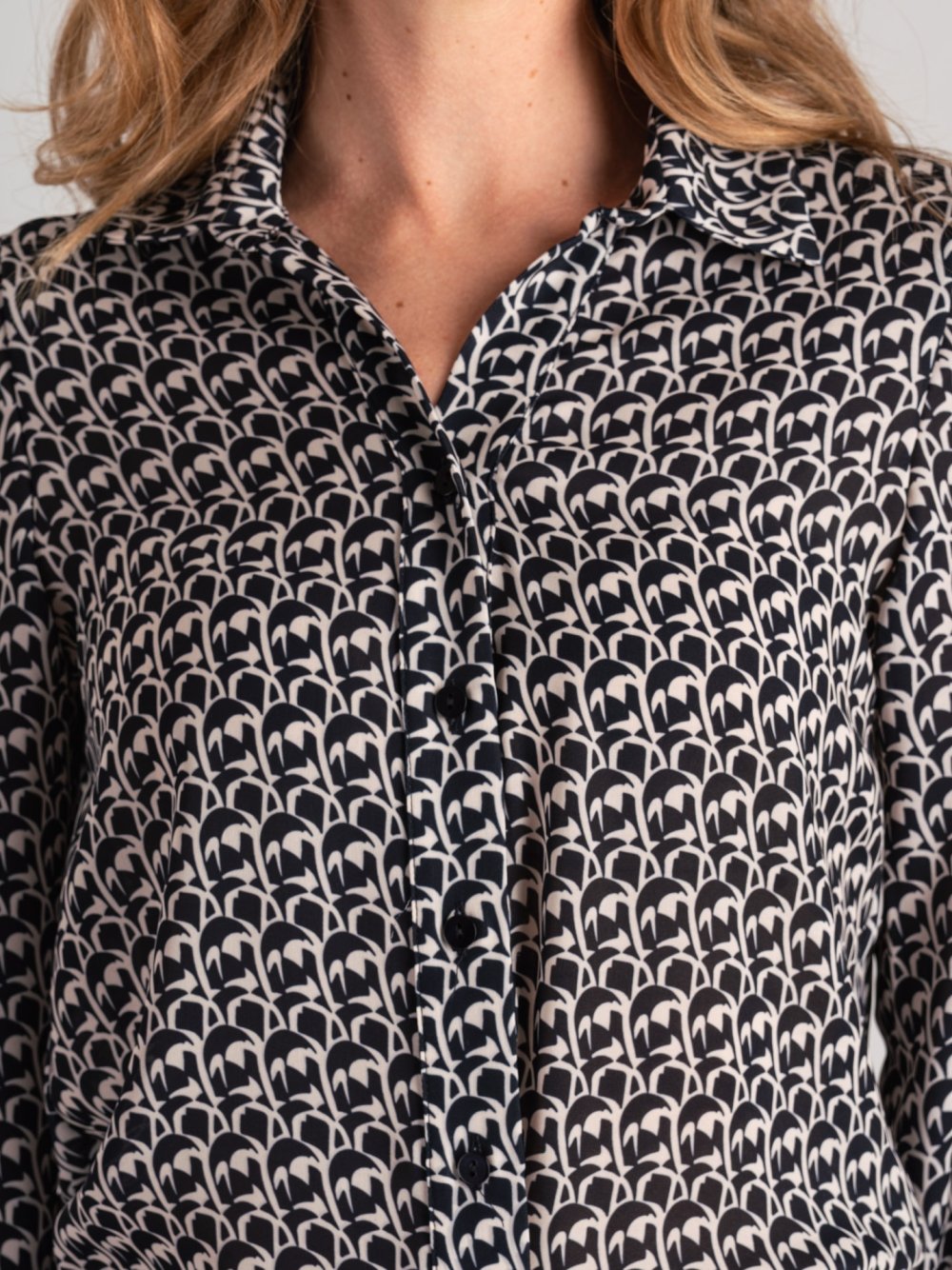 Camisa de mujer de corte suave y vaporoso, confeccionada en georgette estampado doble, ligero y refinado. El modelo tiene el cuello abierto y una línea limpia, con el primer botón situado bajo el busto. El puño de la camisa completa el diseño. Disponible en dos variantes de color: arena con estampado azul o arena con detalles en verde militar.