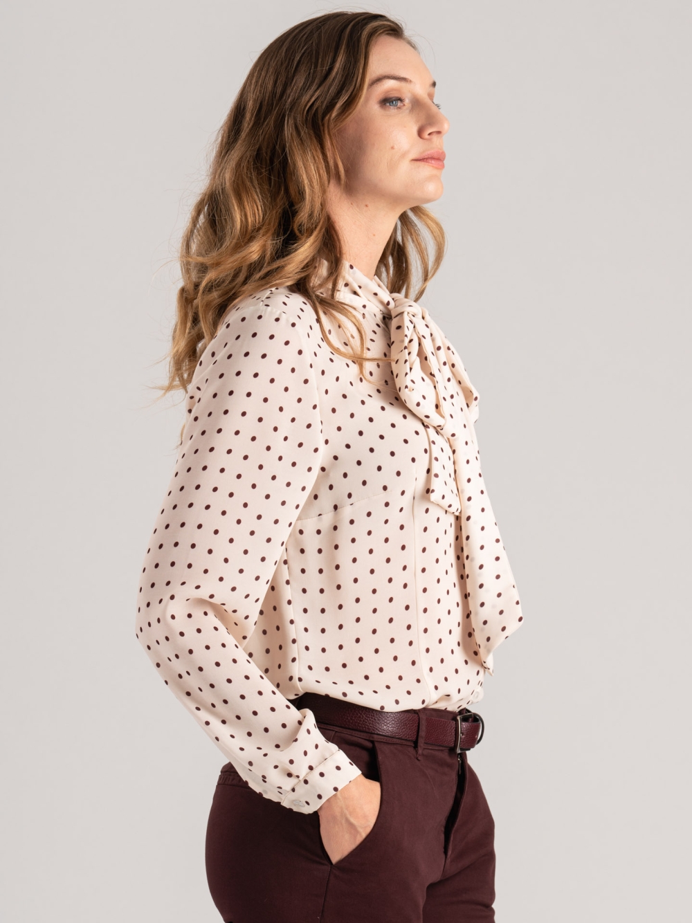 Camisa de mujer en georgette doble con estampado de lunares en color berenjena, lazo en el cuello y puño de la camisa.
