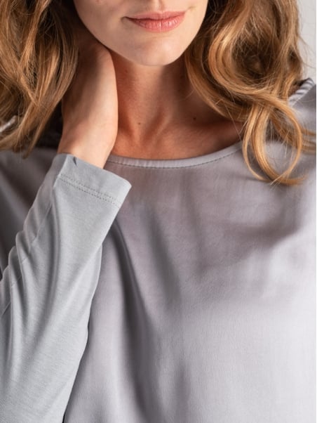 Blusa donna iconica della collezione, proposta nei delicati toni sabbia e perla. Il design unisce l’eleganza del davanti in satin lucido alla comodità del retro in morbido jersey. Il girocollo leggermente sceso e la manica 3/4 rendono questo capo versatile e femminile.