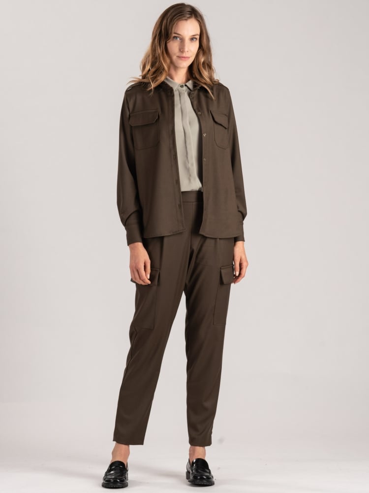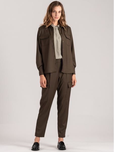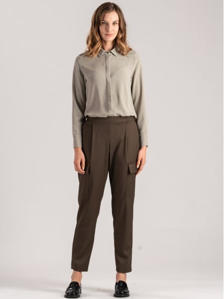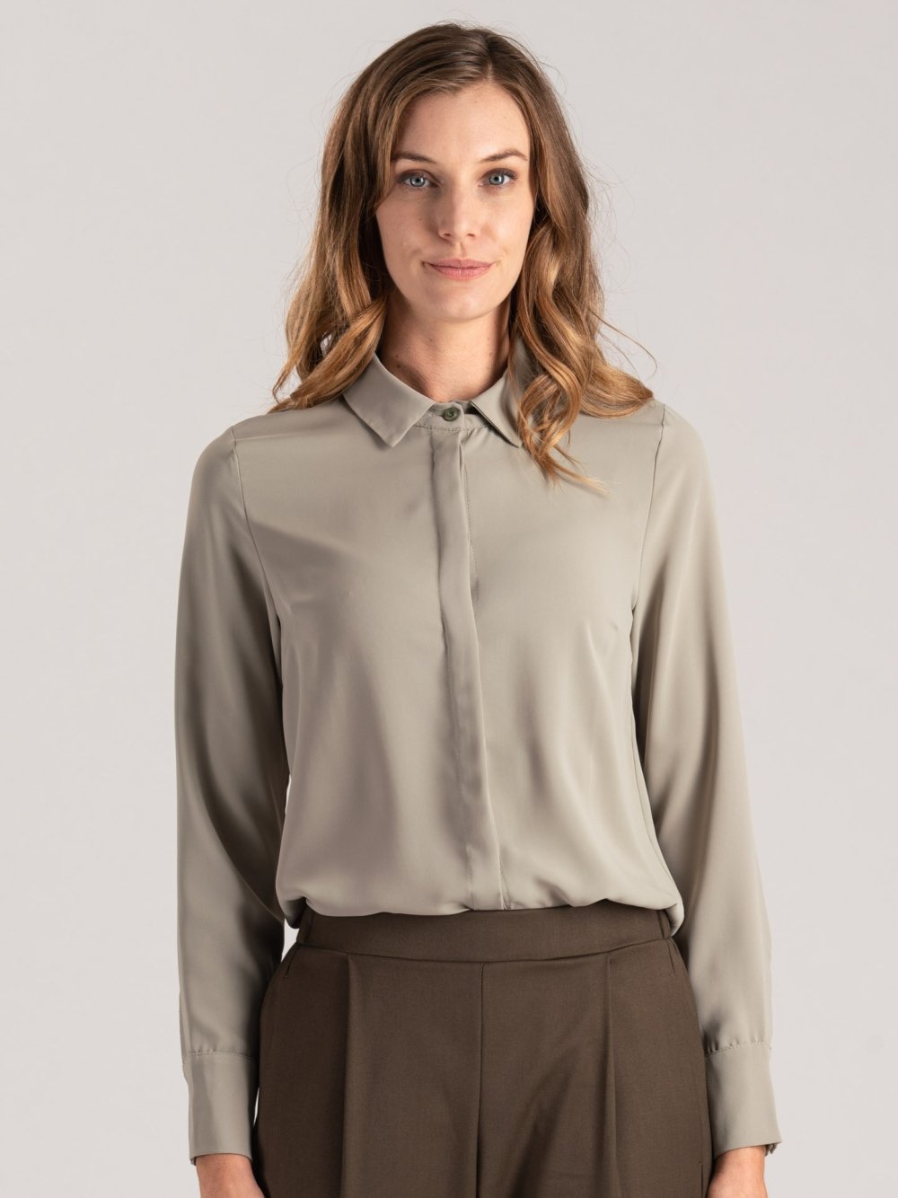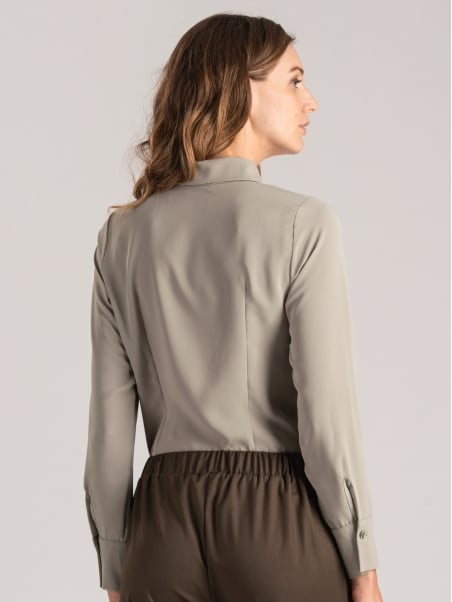 Camicia donna dal taglio classico con pinces, realizzata in tessuto tecnico che garantisce vestibilità fluida e comfort. Proposta nei colori panna e salvia chiaro, unisce linea tradizionale e materiale innovativo per un capo versatile. Ideale sia per look formali che per abbinamenti più contemporanei.
