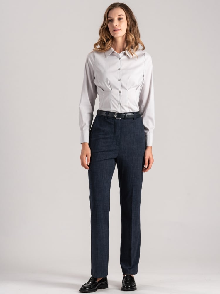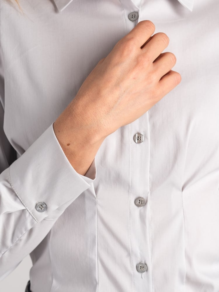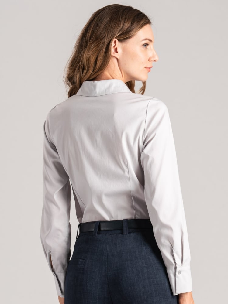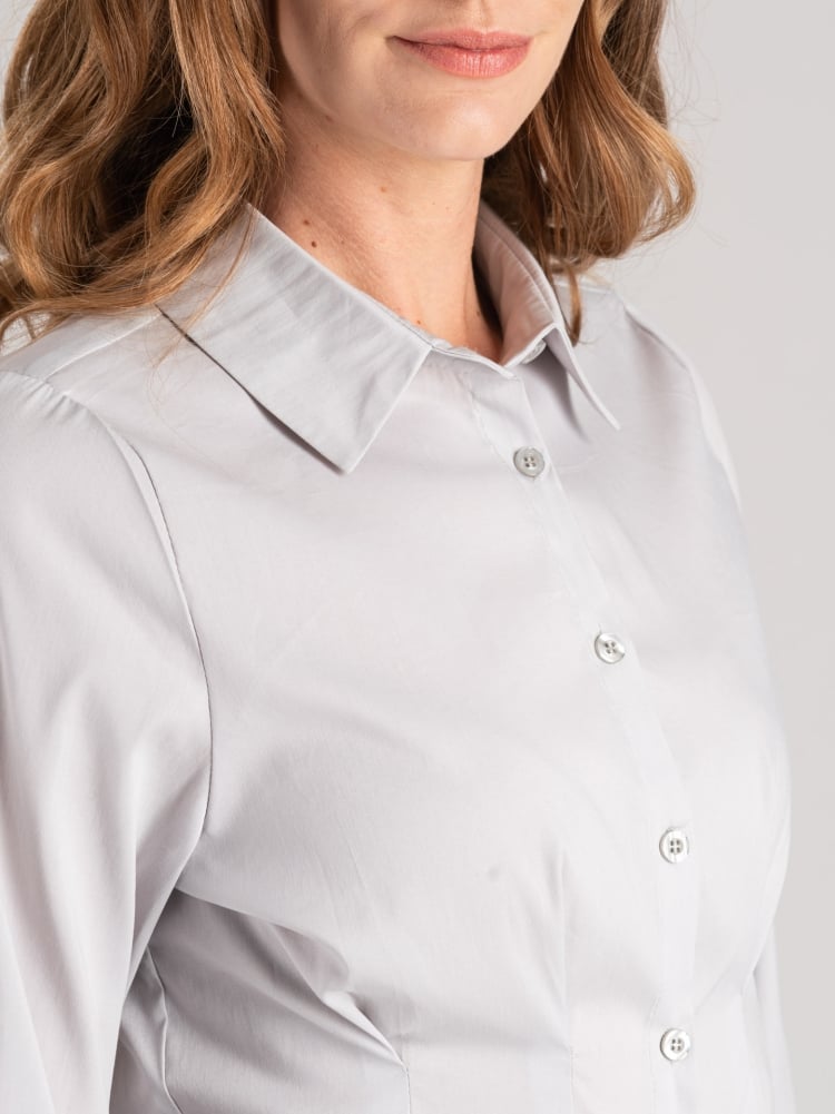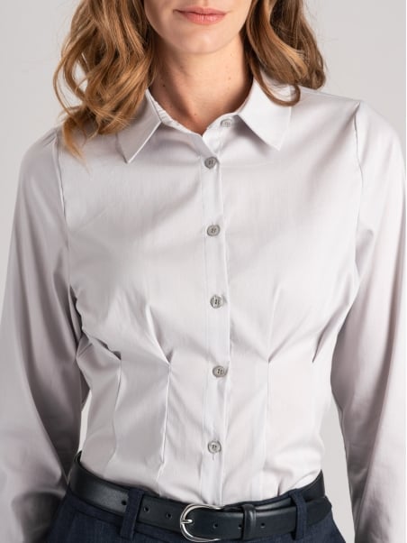 Camicia donna in cotone stretch con doppie pinces, disponibile nei colori azzurro chiaro e ghiaccio.