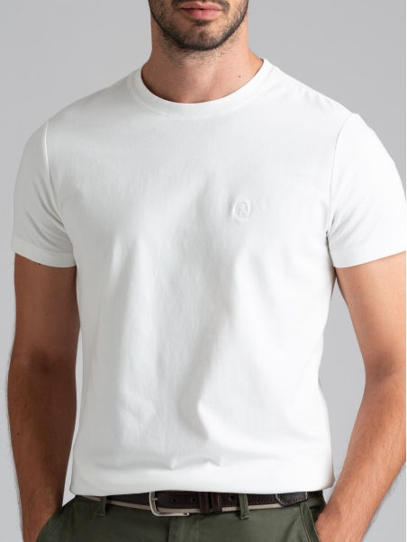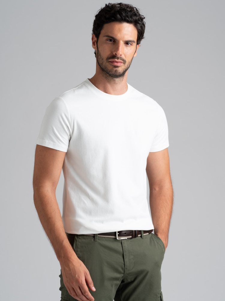Camiseta de hombre en punto cálido a mano, extremadamente suave y agradable al tacto. Una prenda esencial y versátil, ideal para llevar todo el año como capa base debajo de camisas, jerséis o americanas. El corte seco y la comodidad del tejido la convierten en un aliado perfecto para un atuendo práctico y arreglado, apto para cualquier ocasión.