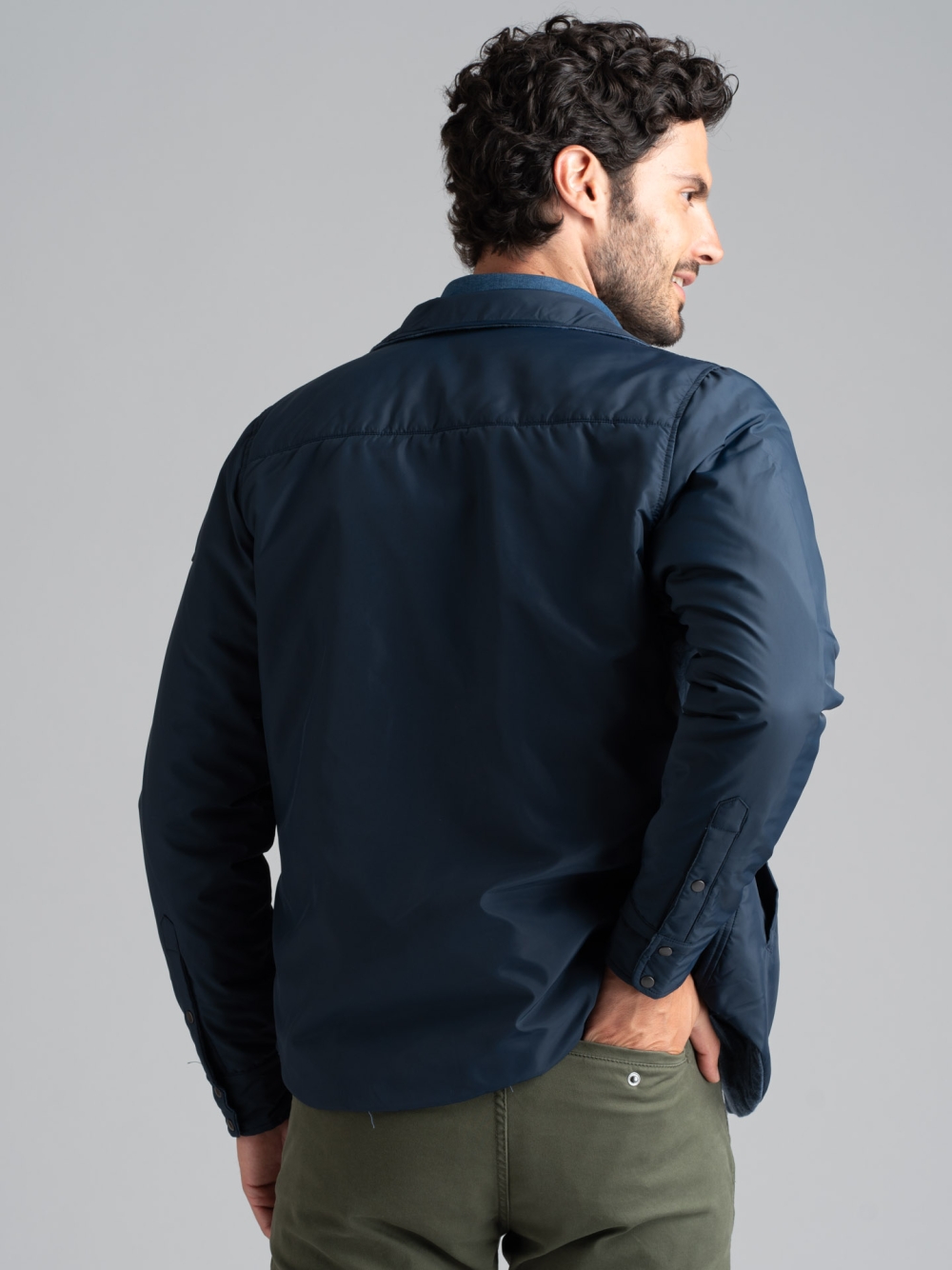 Camisa térmica reversible para hombre modelo chaqueta confeccionada en nailon azul y tejido de sarga de franela diagonal en azul mélange en el interior. Esta camisa térmica tiene cierre de corchete, y dispone de dos bolsillos de parche en la parte delantera con cierre de solapa, también con cierre de corchete, y bolsillos insertados a la altura de la cadera.