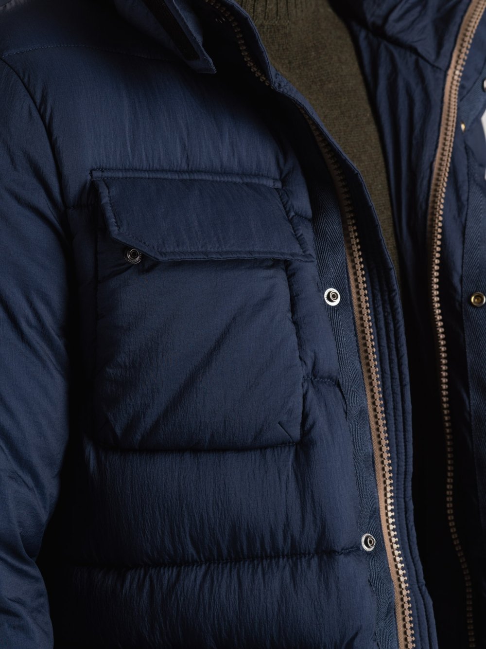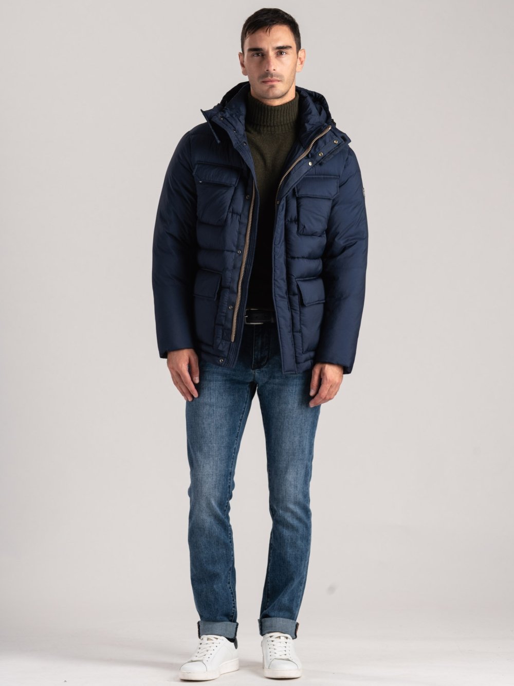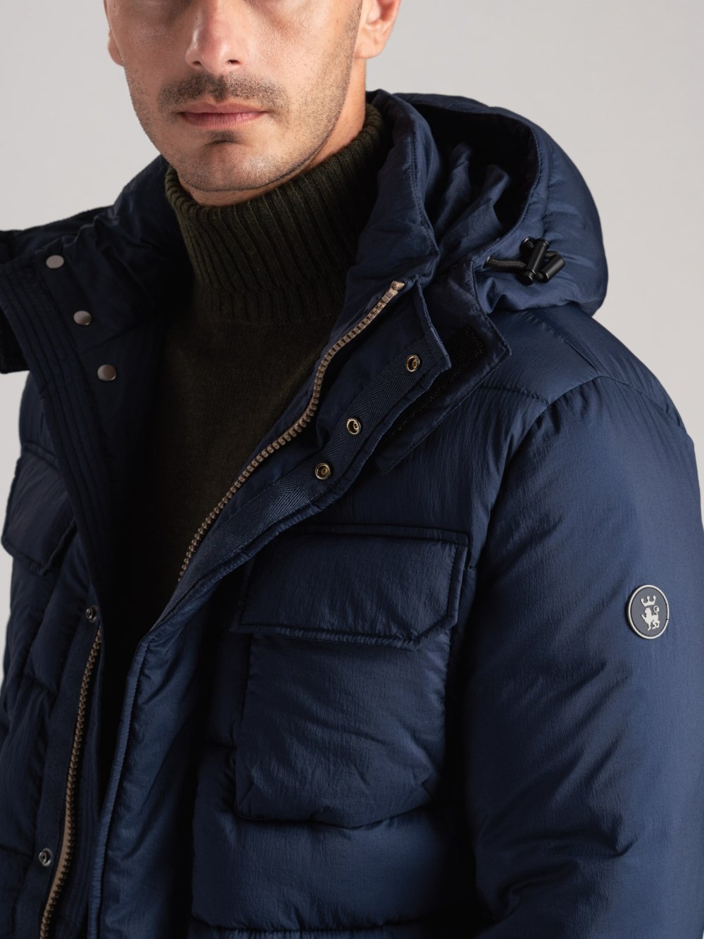 Giubbino uomo in tessuto crinkle con eco piuma, zip waterproof, cappuccio staccabile e doppio polso.