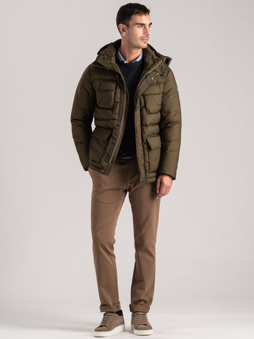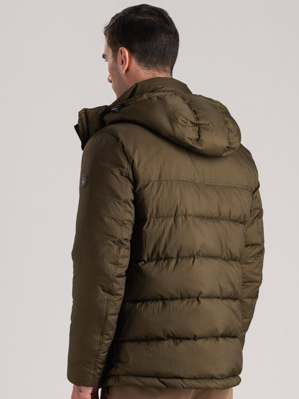 Chaqueta de hombre en tejido arrugado con falso plumón, cremallera impermeable, capucha desmontable y doble puño.