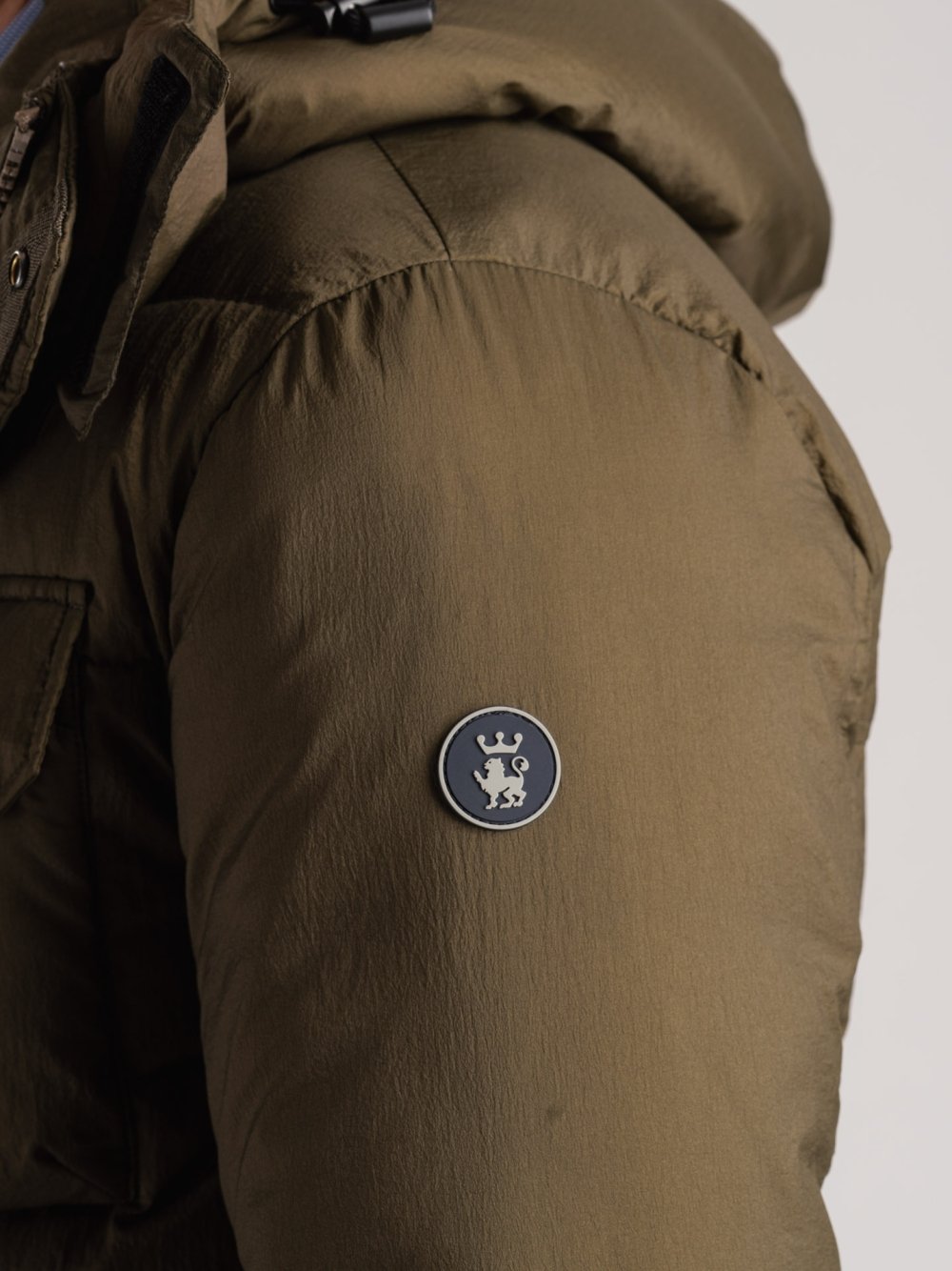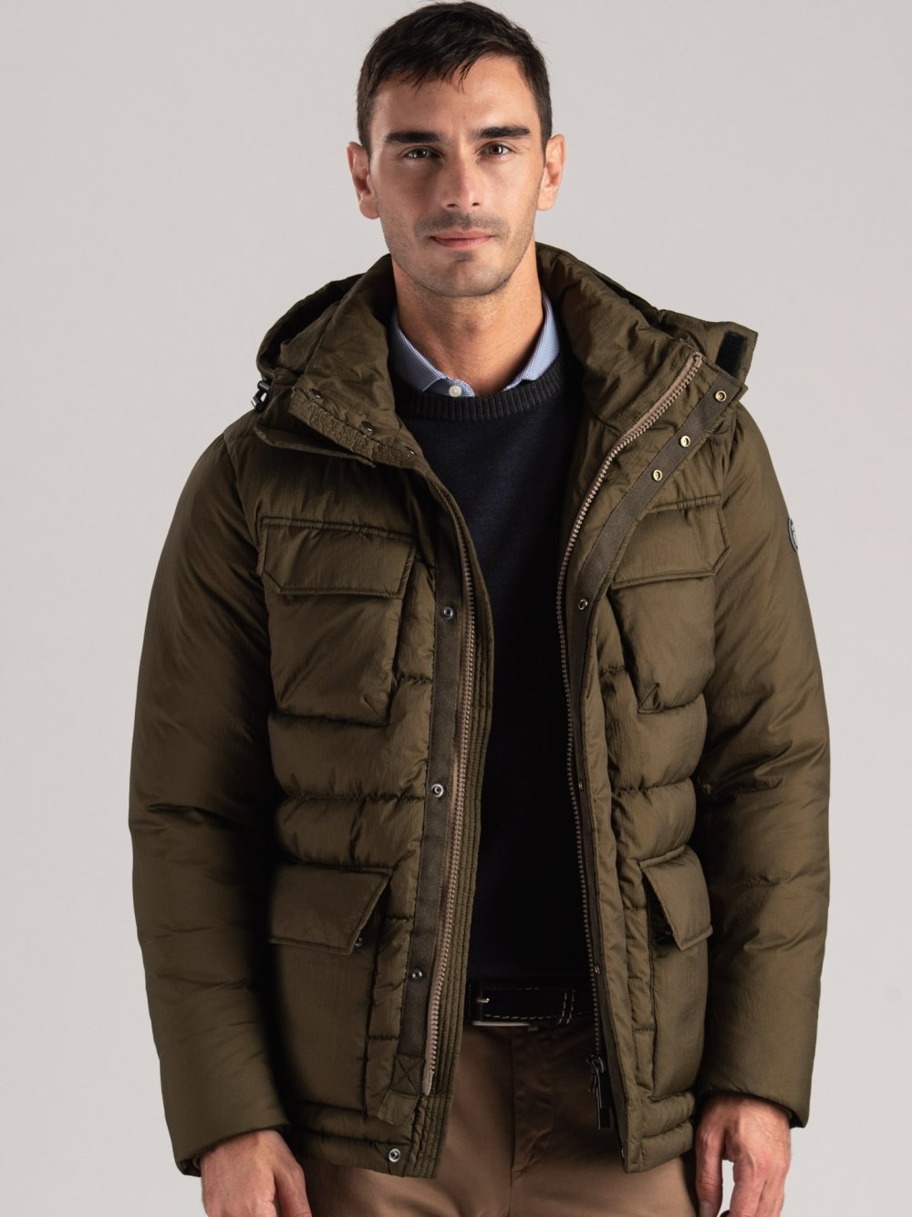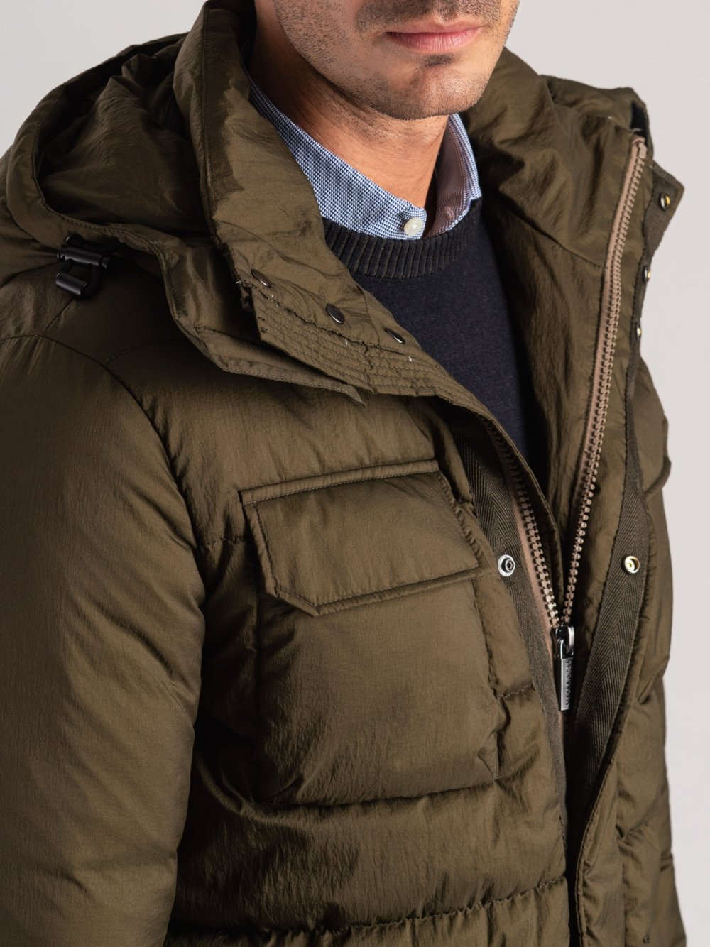 Giubbino uomo in tessuto crinkle con eco piuma, zip waterproof, cappuccio staccabile e doppio polso.