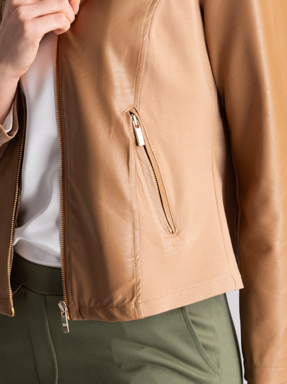Chaqueta de mujer de cuello redondo con cierre de cremallera y bolsillos, confeccionada en piel sintética de alta calidad e inserciones de tejido Punto Milano en el lateral y media manga para ofrecer un ajuste cómodo. Disponible en negro y camel.