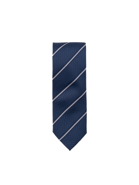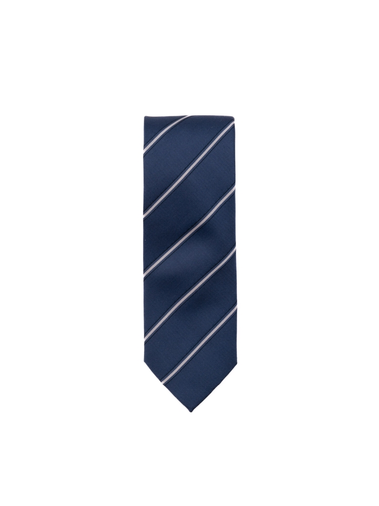 Corbata de seda pura con pala mediana y estampado regimental clásico en tonos marfil, blanco y azul. Un estampado atemporal, adecuado para camisas lisas.