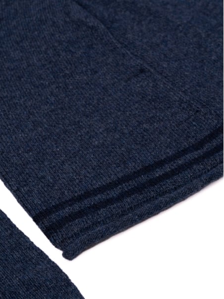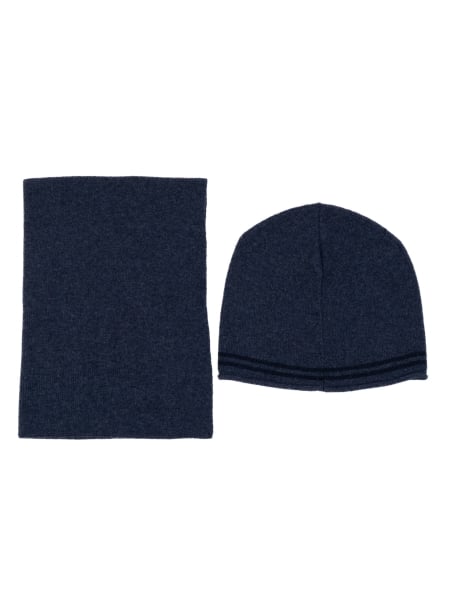 Cappello uomo in maglia misto lana finezza 12 con lavorazione a righe a contrasto. La finitura con rollino completa il design conferendo un aspetto compatto e curato.