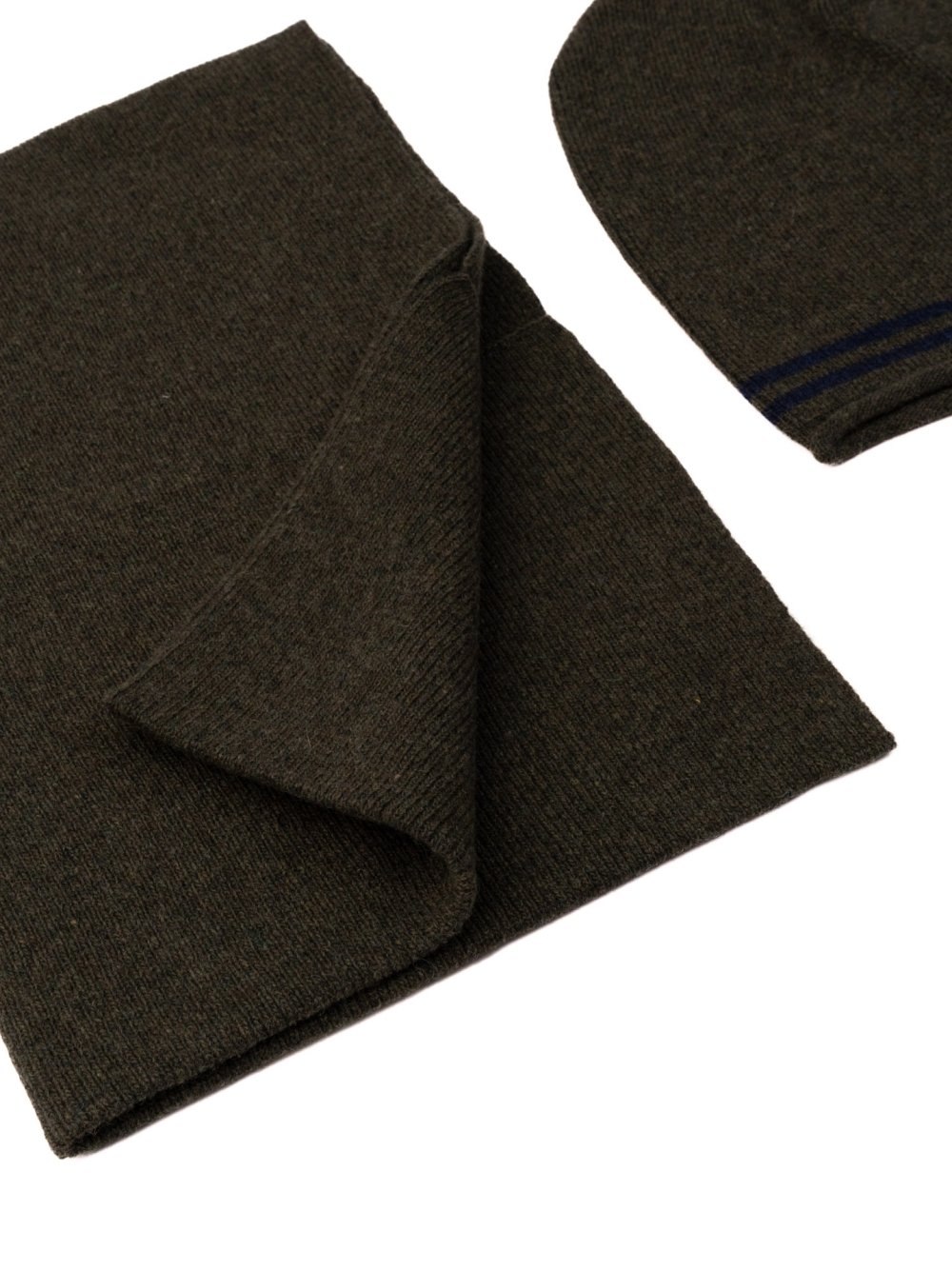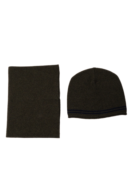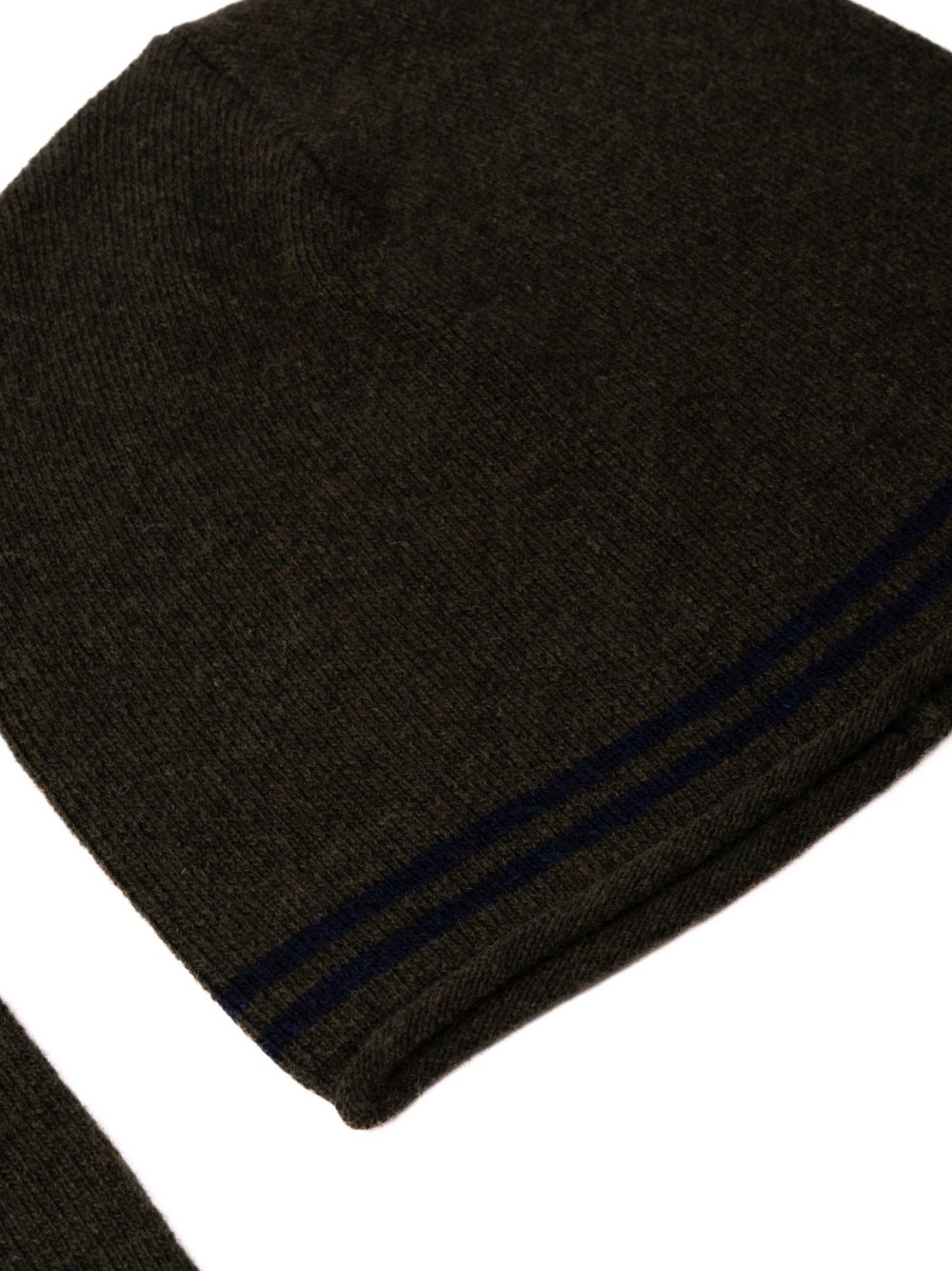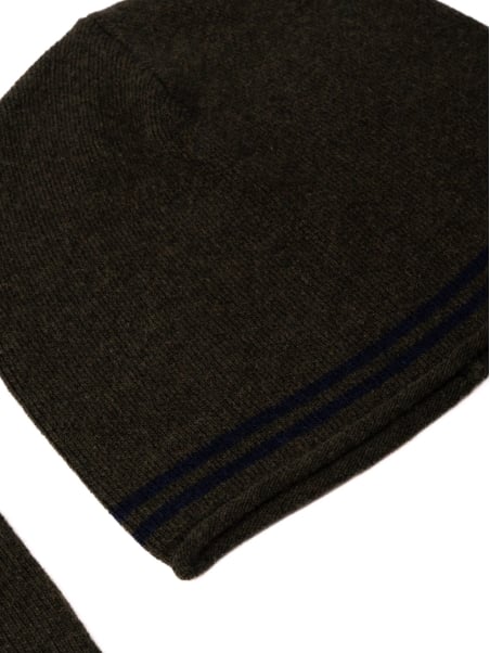 Cappello uomo in maglia misto lana finezza 12 con lavorazione a righe a contrasto. La finitura con rollino completa il design conferendo un aspetto compatto e curato.