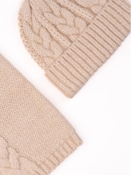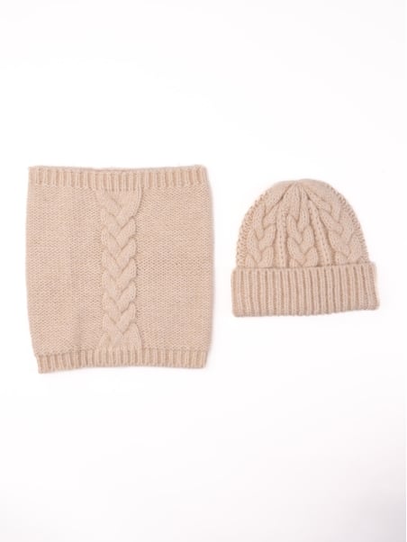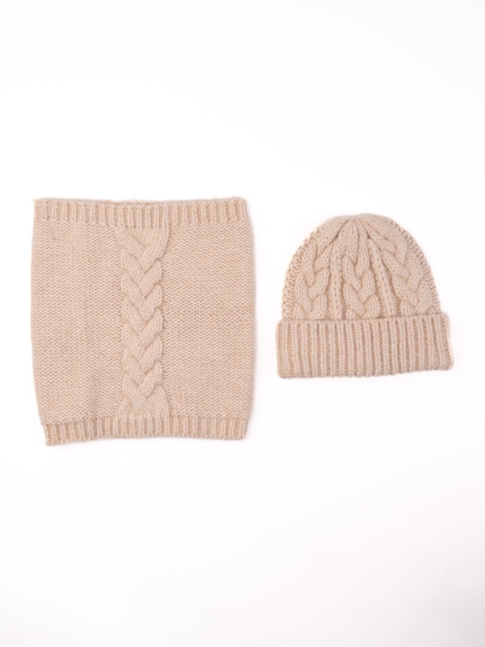 Cappellino in misto lana con lavorazione a trecce, coordinato al collo ad anello. Disponibile in panna, bordeaux e nero.