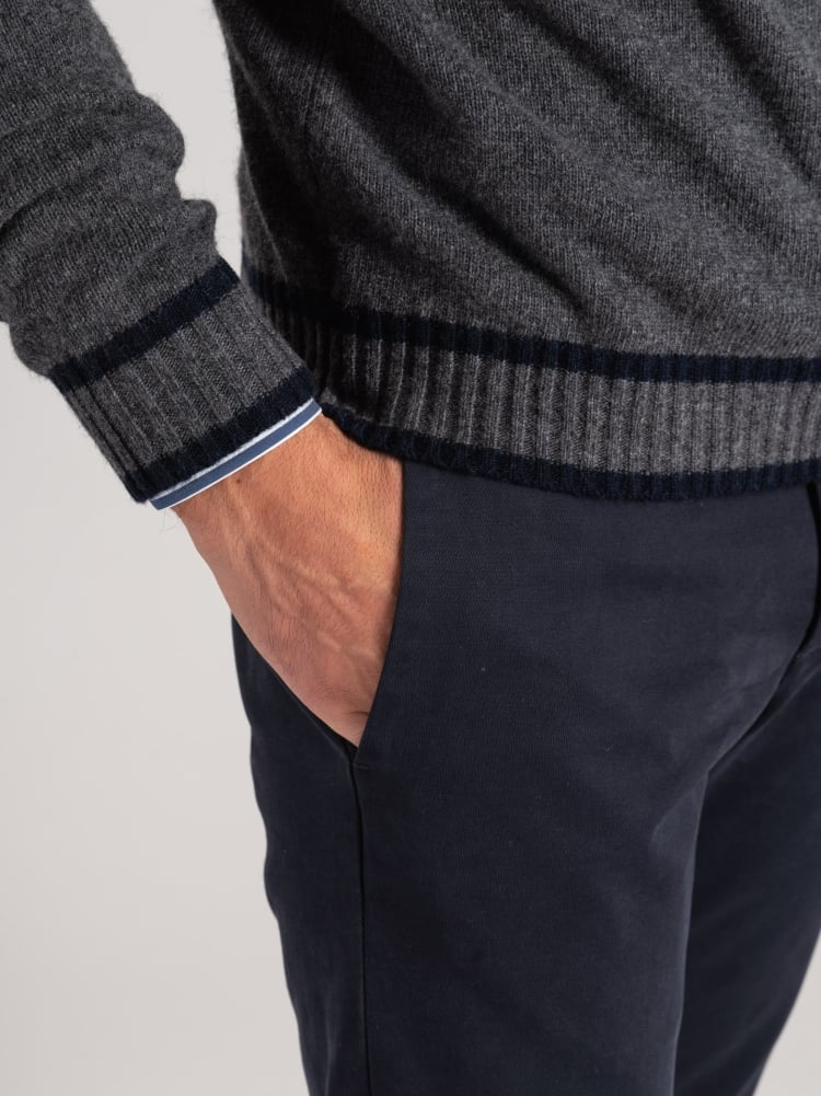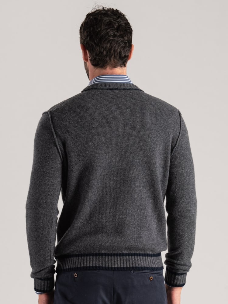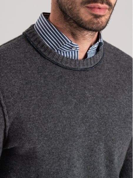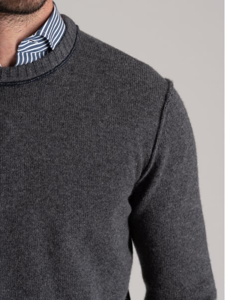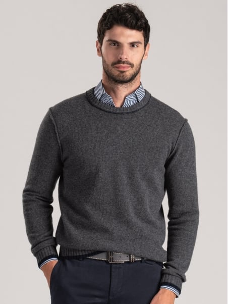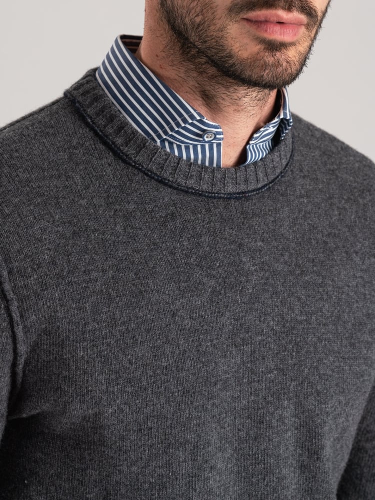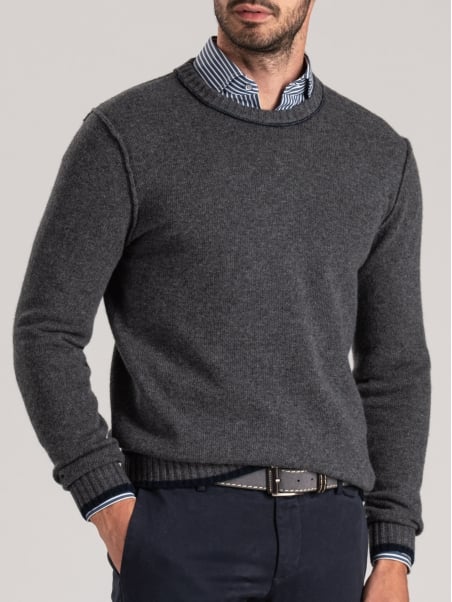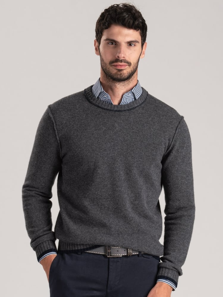 Cuello redondo de hombre en punto de mezcla de lana de galga 7 teñido en hilo, con sisas caracterizadas por costuras invertidas, puños de punto de canalé y volante. El cuello tiene una costura azul de contraste en la variante gris, mientras que el modelo de color burdeos tiene inserciones grises.