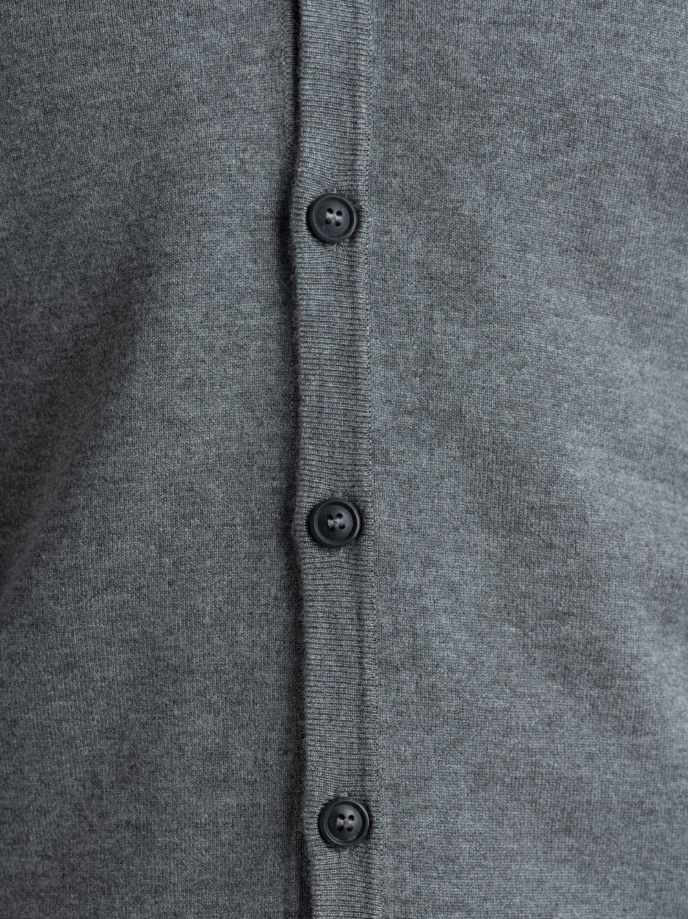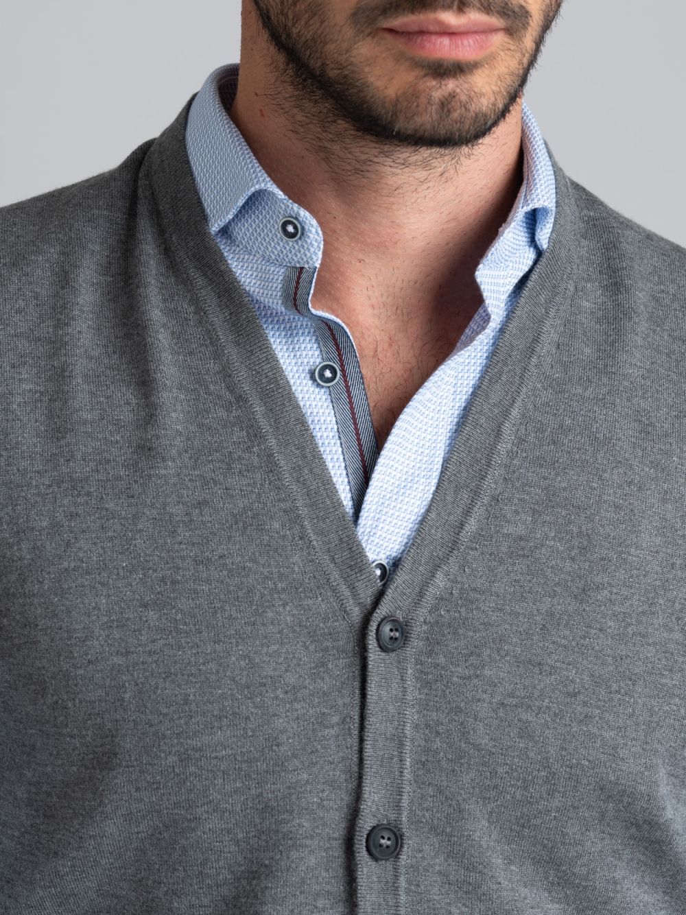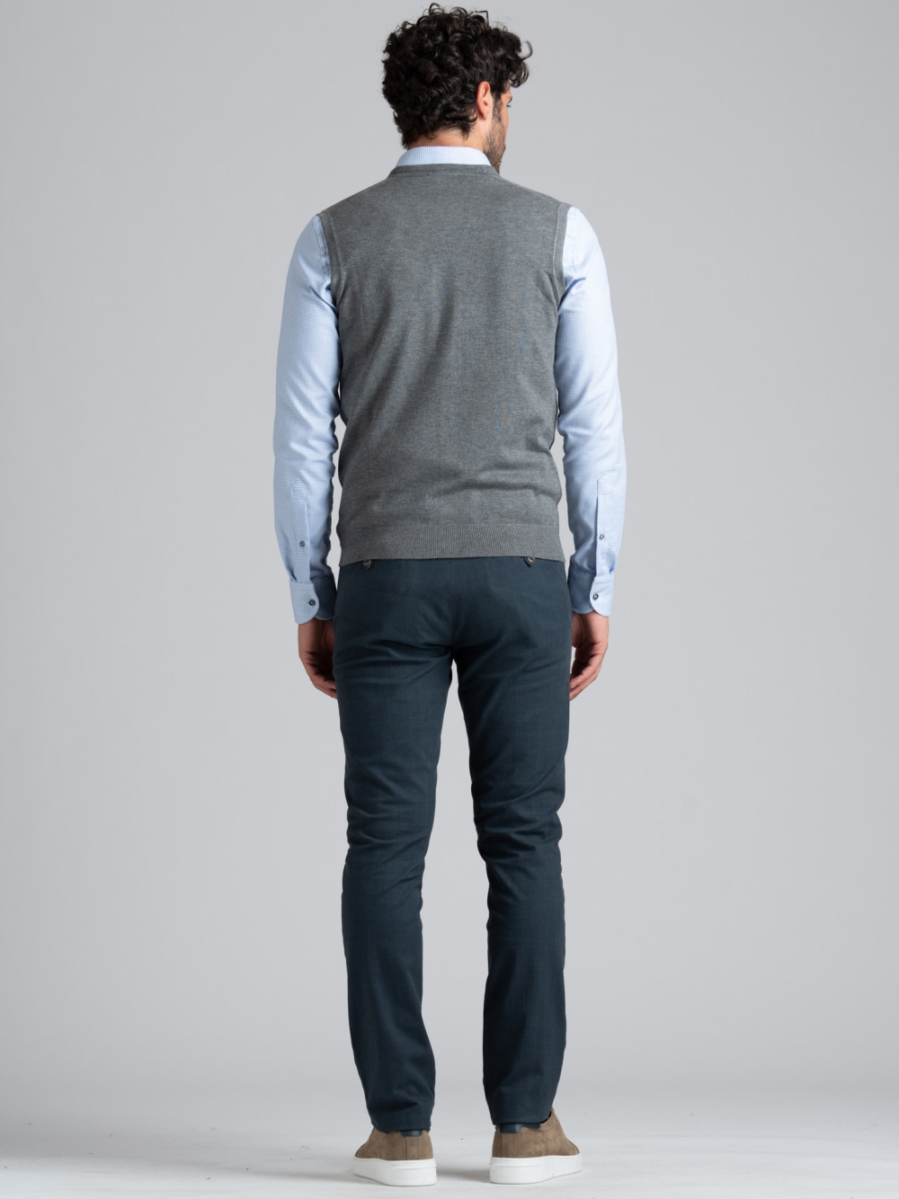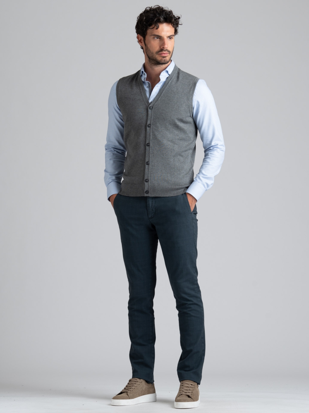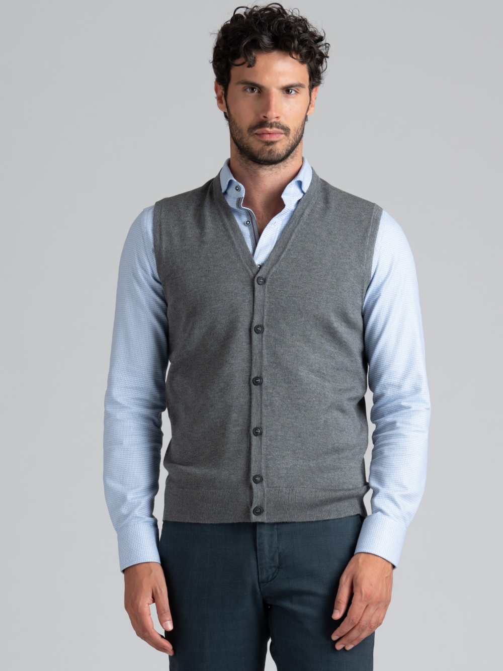 Modelo de chaleco para hombre confeccionado en tejido de viscosa liso de galga 12 y cierre de botones, disponible en azul y gris. Este chaleco de punto es una prenda versátil adecuada para entretiempo, diseñada también como chaqueta interior.