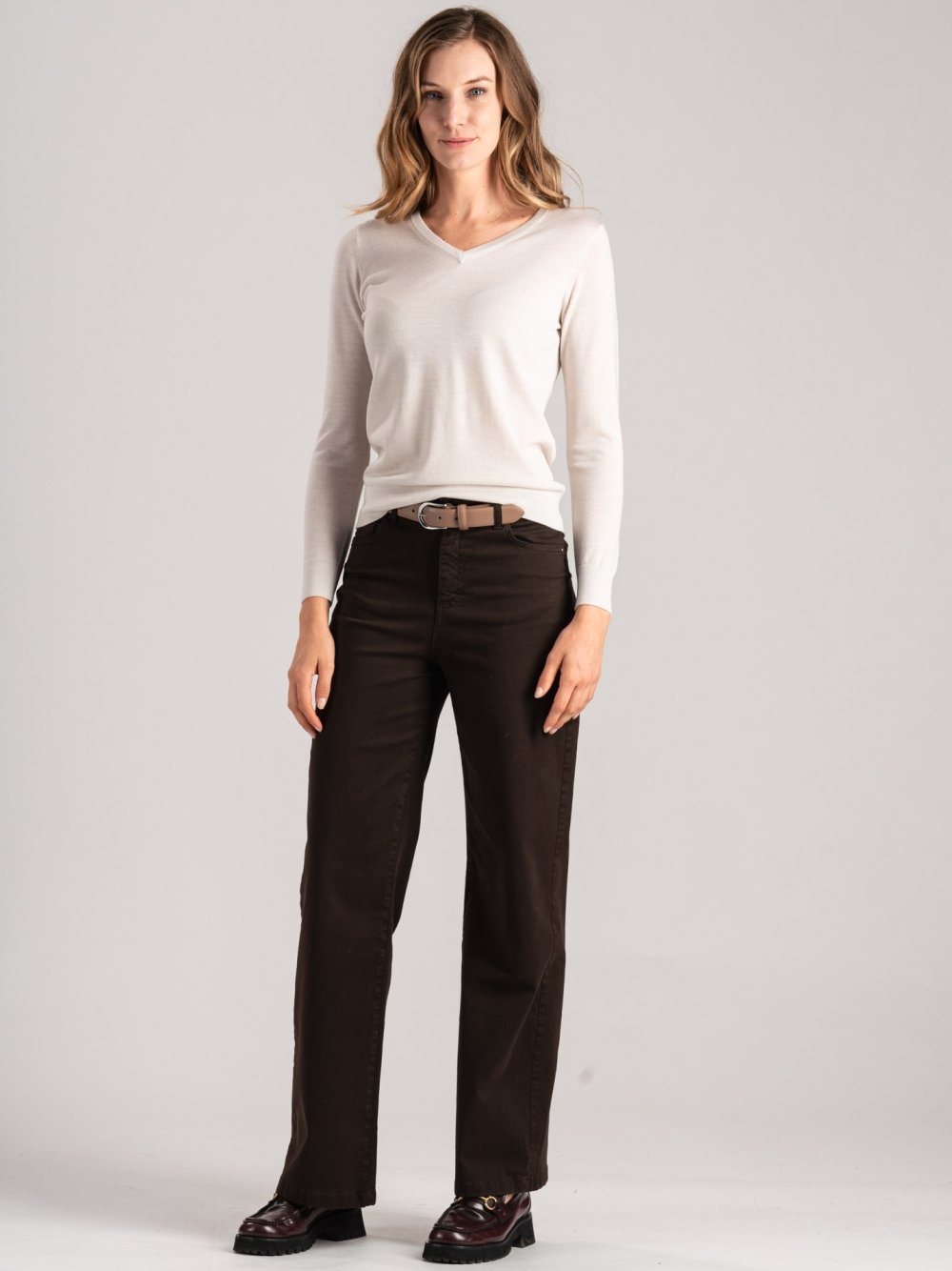 Jersey de mujer con cuello de pico de pura lana merina extrafina, galga 14. Una prenda de la máxima calidad, diseñada para ofrecer comodidad y refinamiento en cualquier ocasión. Línea limpia y esencial, ideal como prenda interior o para combinar con una camisa para un look elegante y atemporal. Disponible en crema, camel y negro.