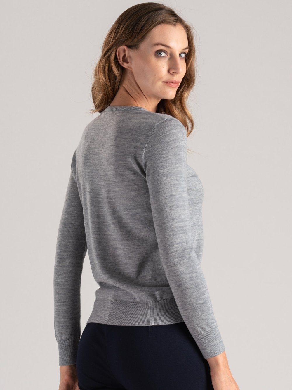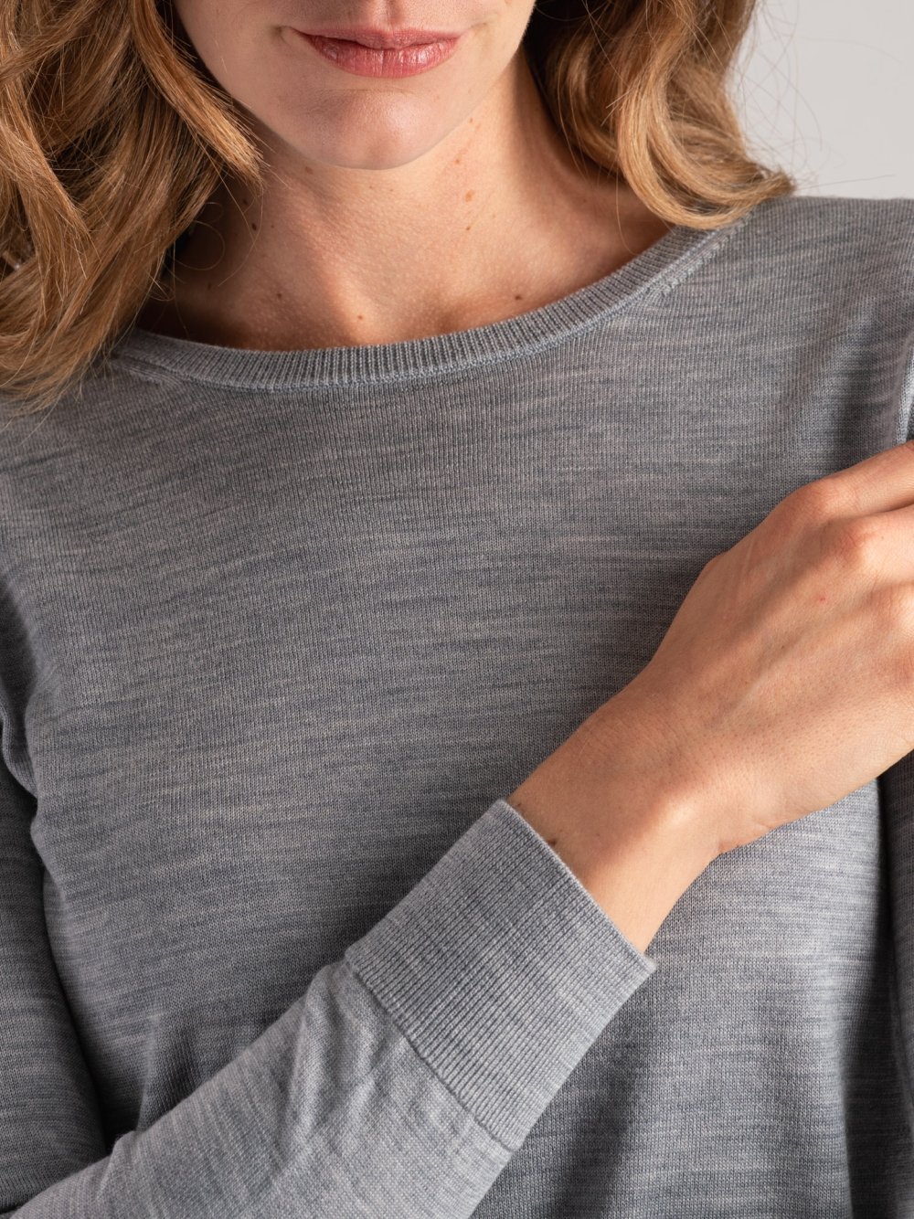 Jersey de cuello redondo para mujer de lana merina extrafina, fabricado con hilo 100% natural de la máxima calidad y finura 14. Línea esencial y ajuste impecable, ideal como prenda interior o para llevar encima de una camisa. Disponible en tres colores básicos, crema, camel y gris perla, es una prenda refinada y versátil que no puede faltar en el vestuario diario.