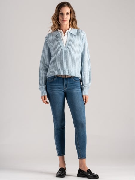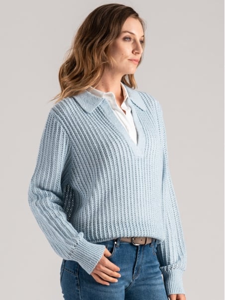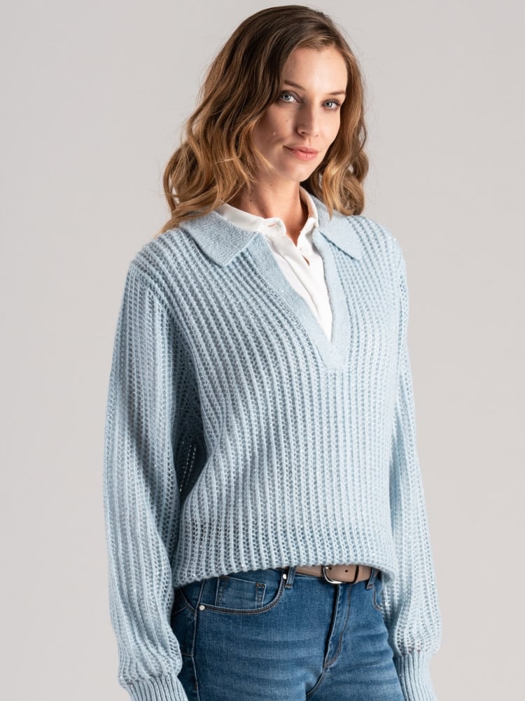 Maglia donna dallo stile luminoso e rilassato, con lavorazione tipo maglia inglese arricchita da un filo con micro paillettes tono su tono. Il modello, comodo e femminile, presenta uno scollo a V stile polo e una vestibilità fluida. Disponibile nelle delicate tonalità azzurro polvere o beige, è pensata per aggiungere luce al look quotidiano con naturale eleganza.