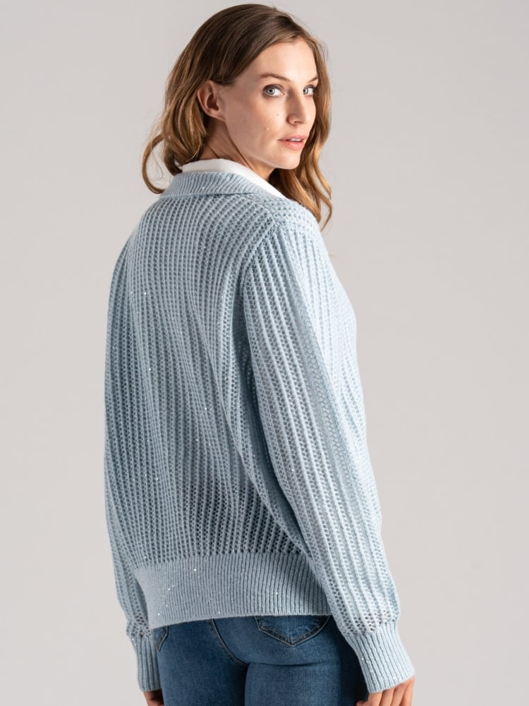 Maglia donna in maglia inglese con micro paillettes, scollo polo a V e vestibilità fluida.