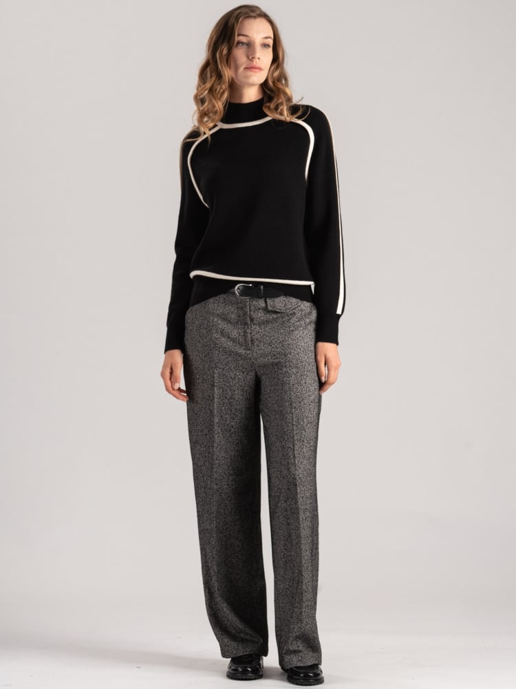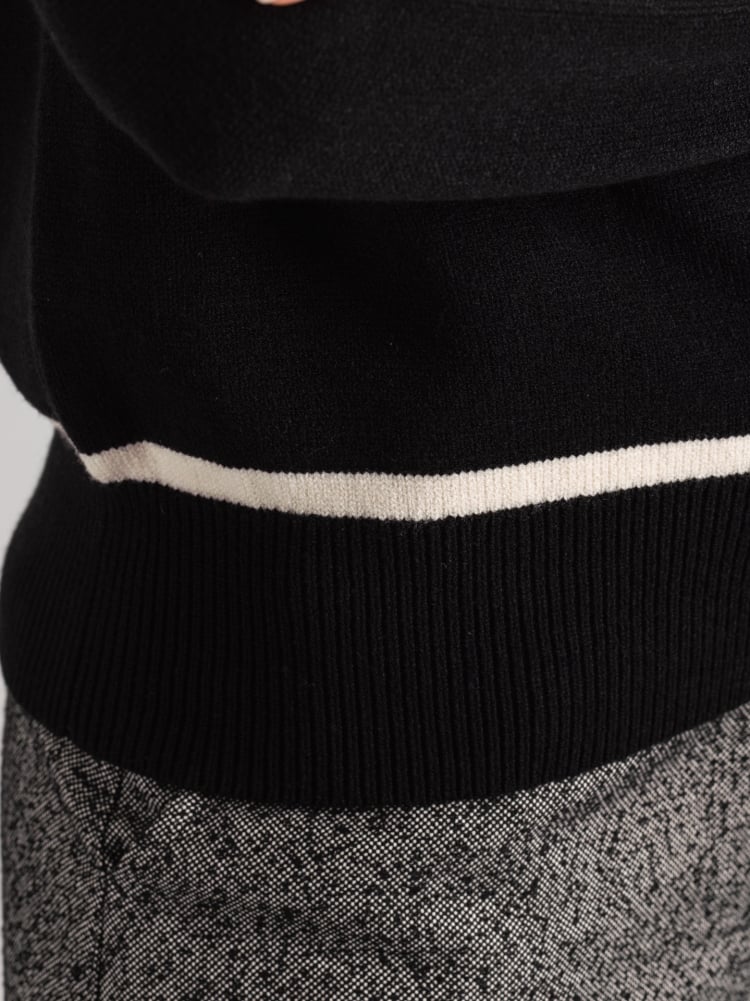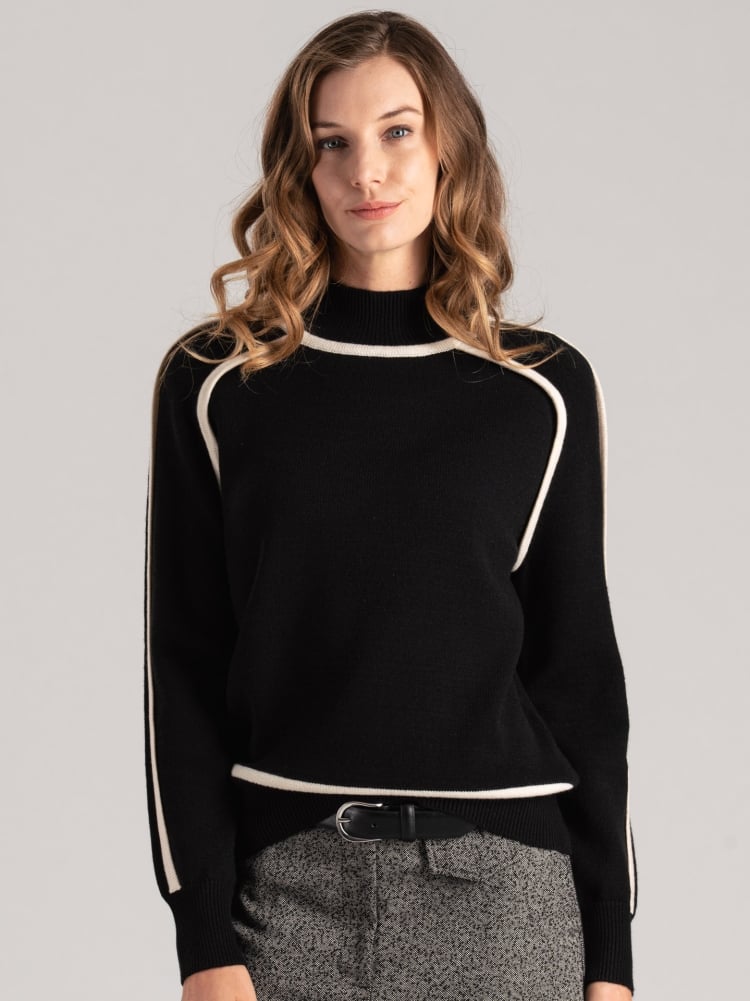 Maglia donna con collo alto stile lupetto, caratterizzata da un raffinato gioco di rifiniture in maglia a contrasto che creano un disegno geometrico originale. Proposta in tre varianti colore, melanzana e nero, nero e beige, beige e nero, è ideale per aggiungere un tocco grafico e sofisticato al guardaroba invernale.