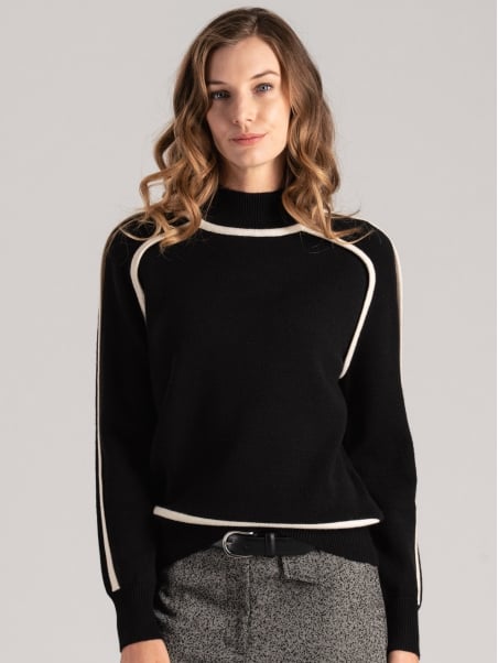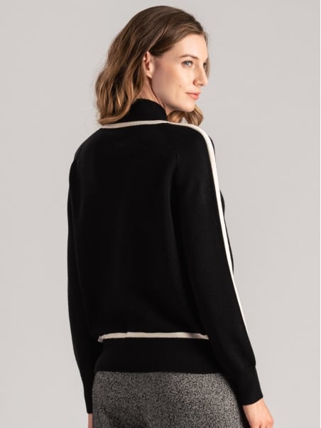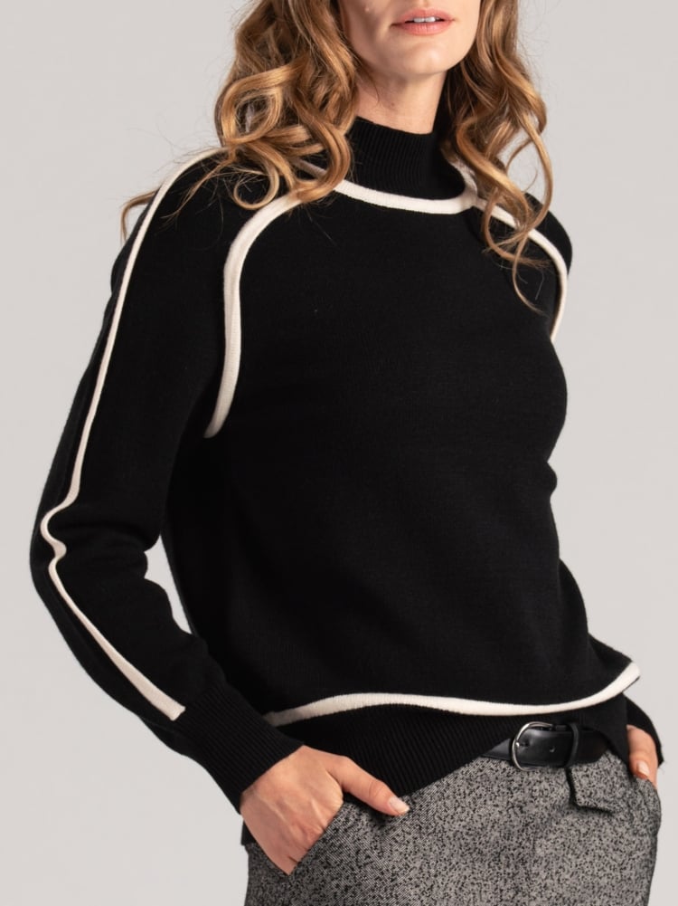 Maglia donna a lupetto con dettagli geometrici a contrasto, disponibile in tre combinazioni colore.