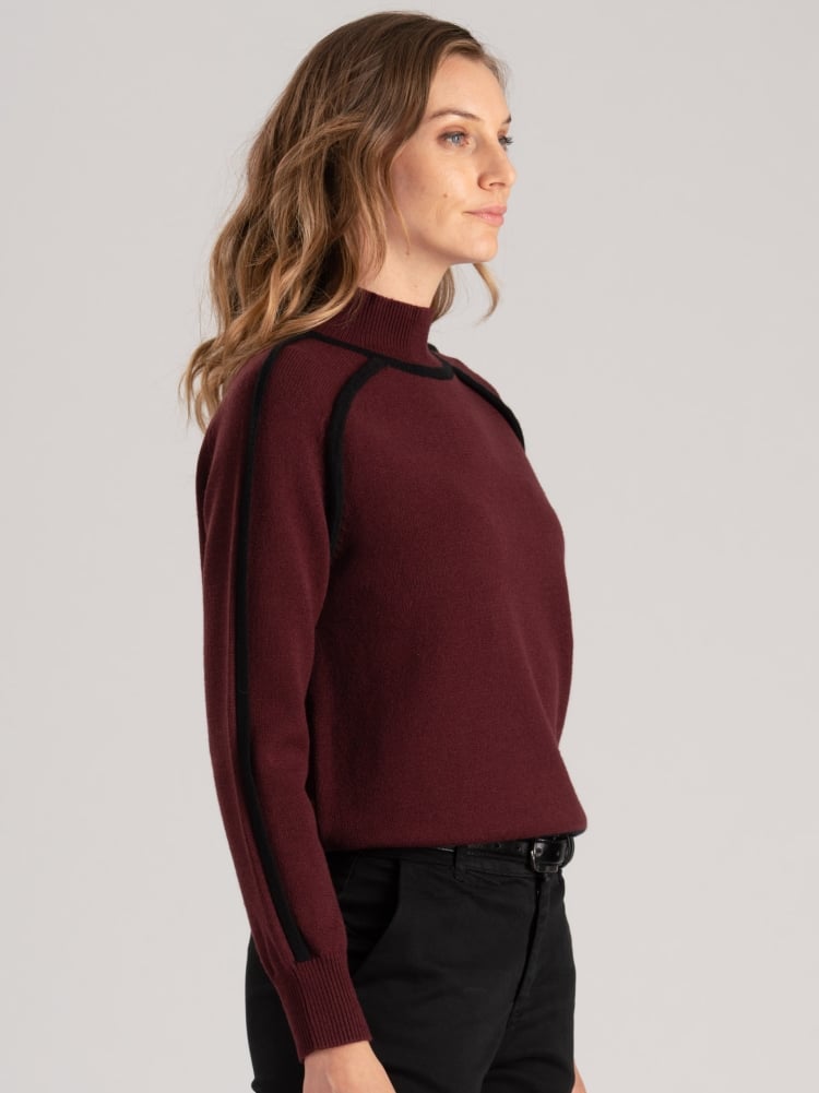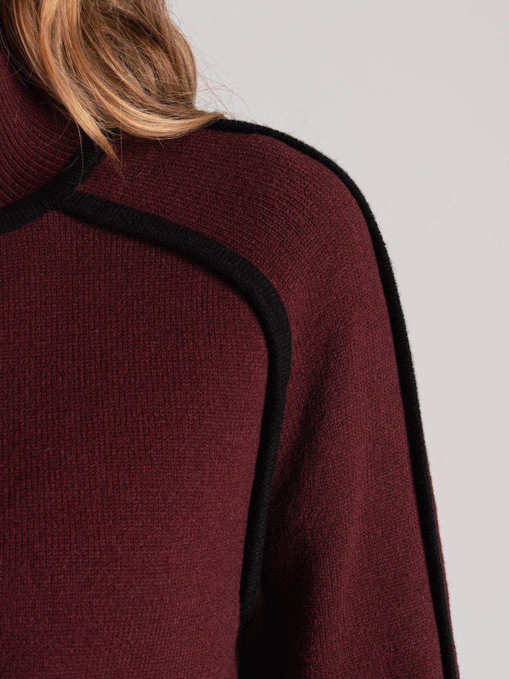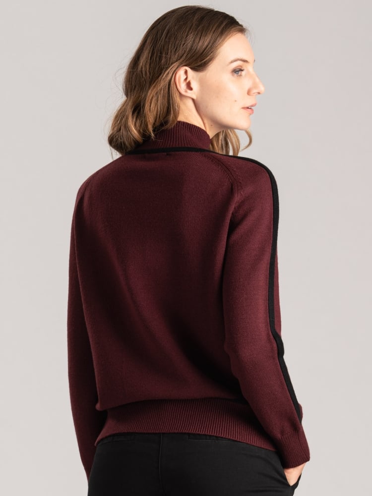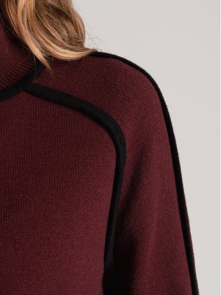 Maglia donna con collo alto stile lupetto, caratterizzata da un raffinato gioco di rifiniture in maglia a contrasto che creano un disegno geometrico originale. Proposta in tre varianti colore, melanzana e nero, nero e beige, beige e nero, è ideale per aggiungere un tocco grafico e sofisticato al guardaroba invernale.