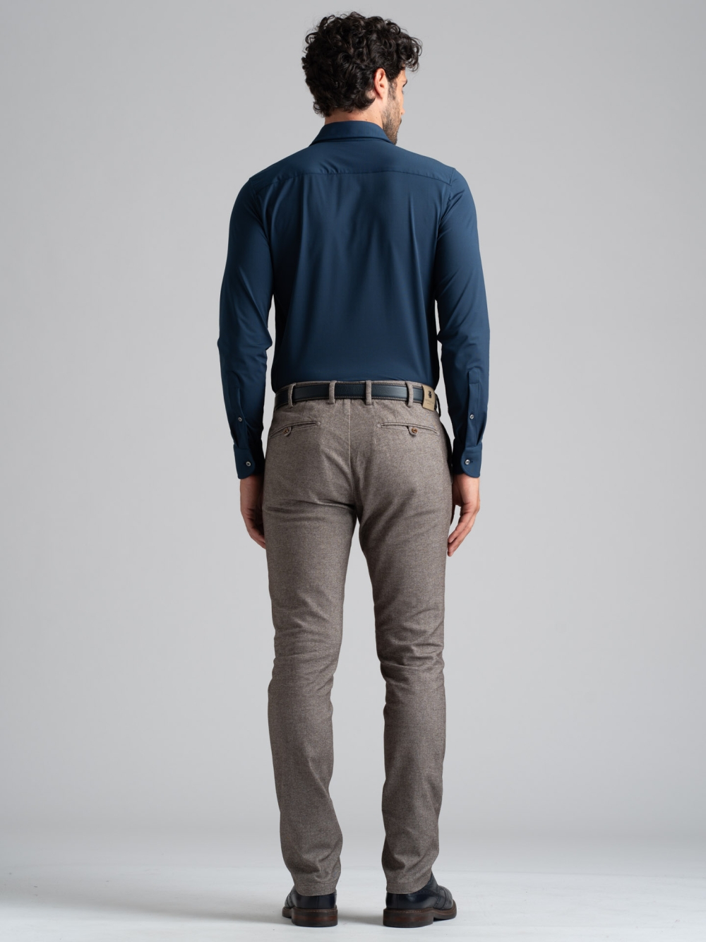 Pantalón de caballero confeccionado en cálido tejido de algodón efecto lana, con estampado de rayas diplomáticas en azul y marrón oscuro. En el interior, el pantalón está cuidadosamente confeccionado en tejido crema. En la parte trasera tiene bolsillos de ojal dobles con picanel.