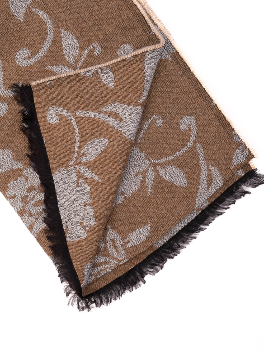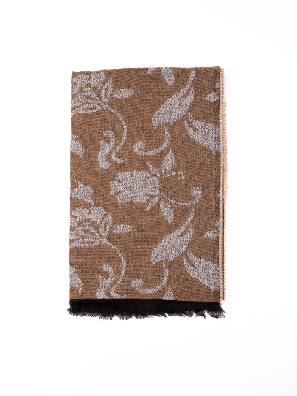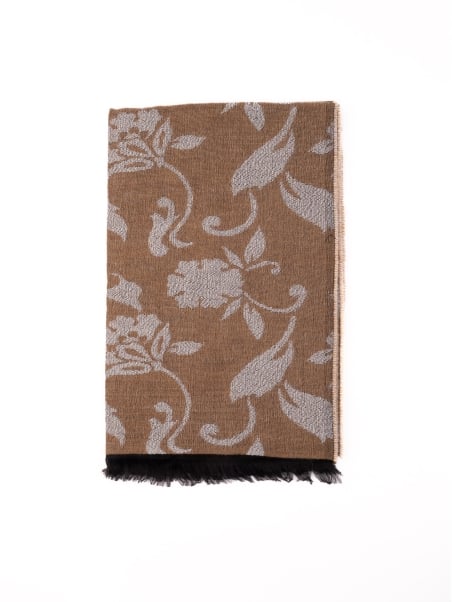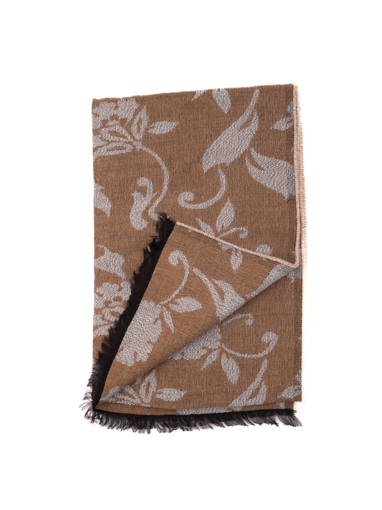 Pañuelo de mujer con estampado monocromático bicolor en tonos grises y berenjena. El acabado deshilachado de los bordes aporta movimiento y carácter al diseño. Un accesorio suave y versátil, ideal para completar looks de invierno coordinándolo tanto con prendas elegantes como informales.