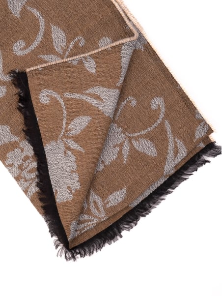 Pañuelo bicolor de mujer en tonos grises y berenjena, con estampado monocromático y acabado deshilachado.