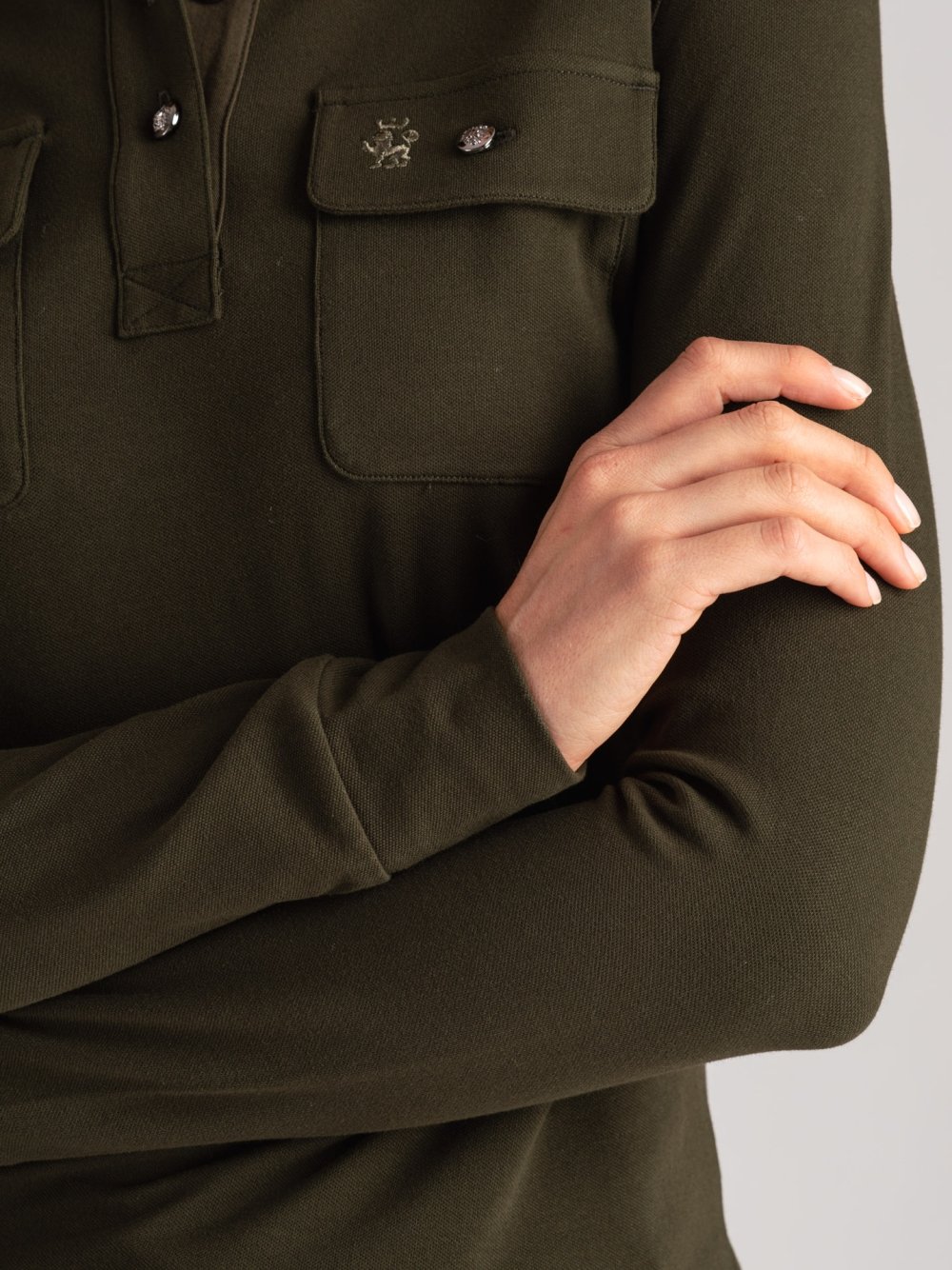 Polo de mujer de algodón piqué elástico para un ajuste cómodo y femenino. El modelo está adornado con botones de microheráldica galvánica bronceada, bolsillos de parche con solapa y bordado tono sobre tono del logotipo INVIDIA 1973. El puño de punto y el puño interior del cuello garantizan comodidad y estructura.