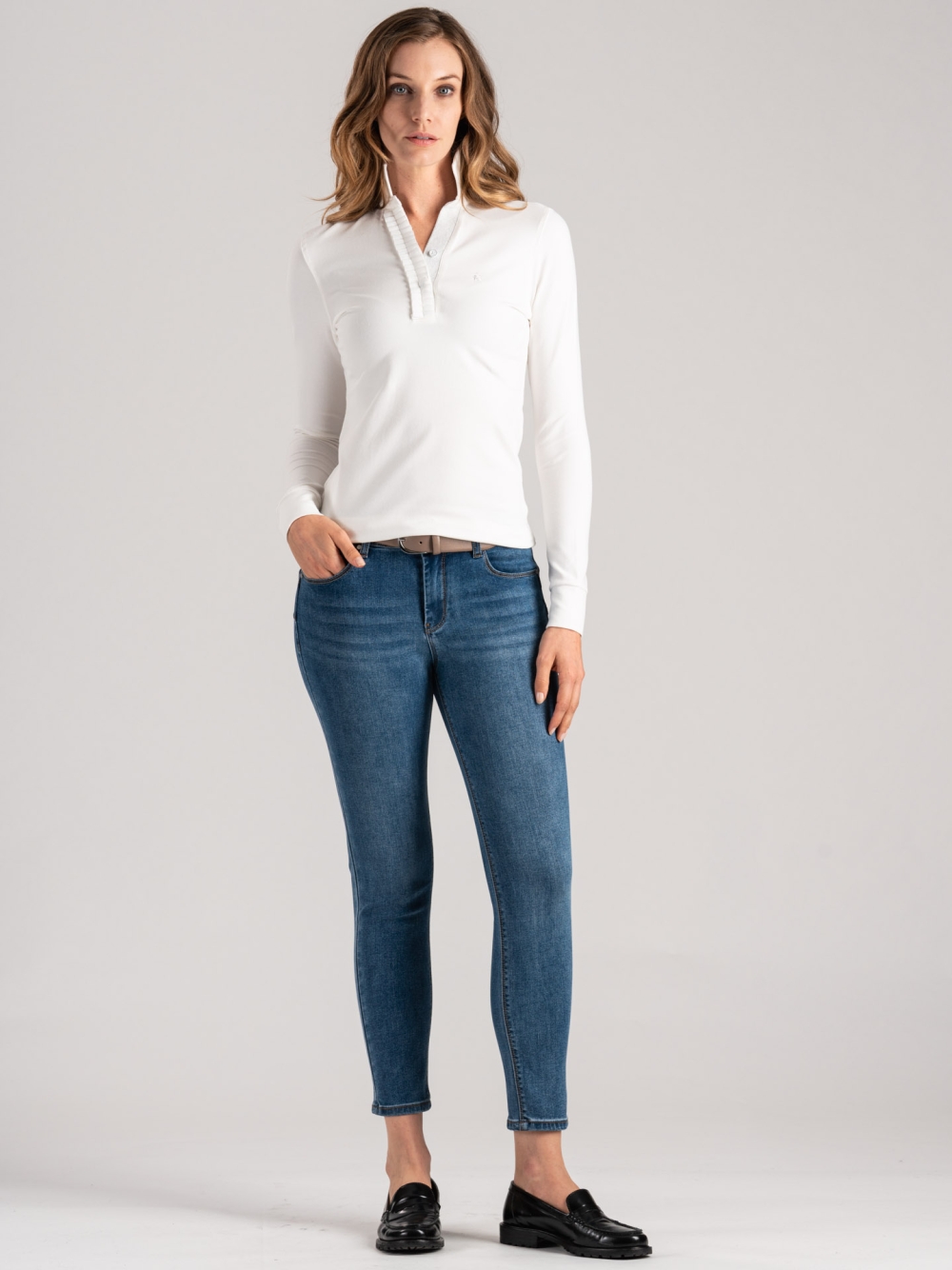 Polo de mujer de punto de algodón elástico con una línea femenina y refinada, adornado con un volante de grosgrain en canalé de lúrex en el canolo para darle un toque brillante y sofisticado. El logotipo INVIDIA 1973 está bordado tono sobre tono en el pecho. Disponible en crema y azul.