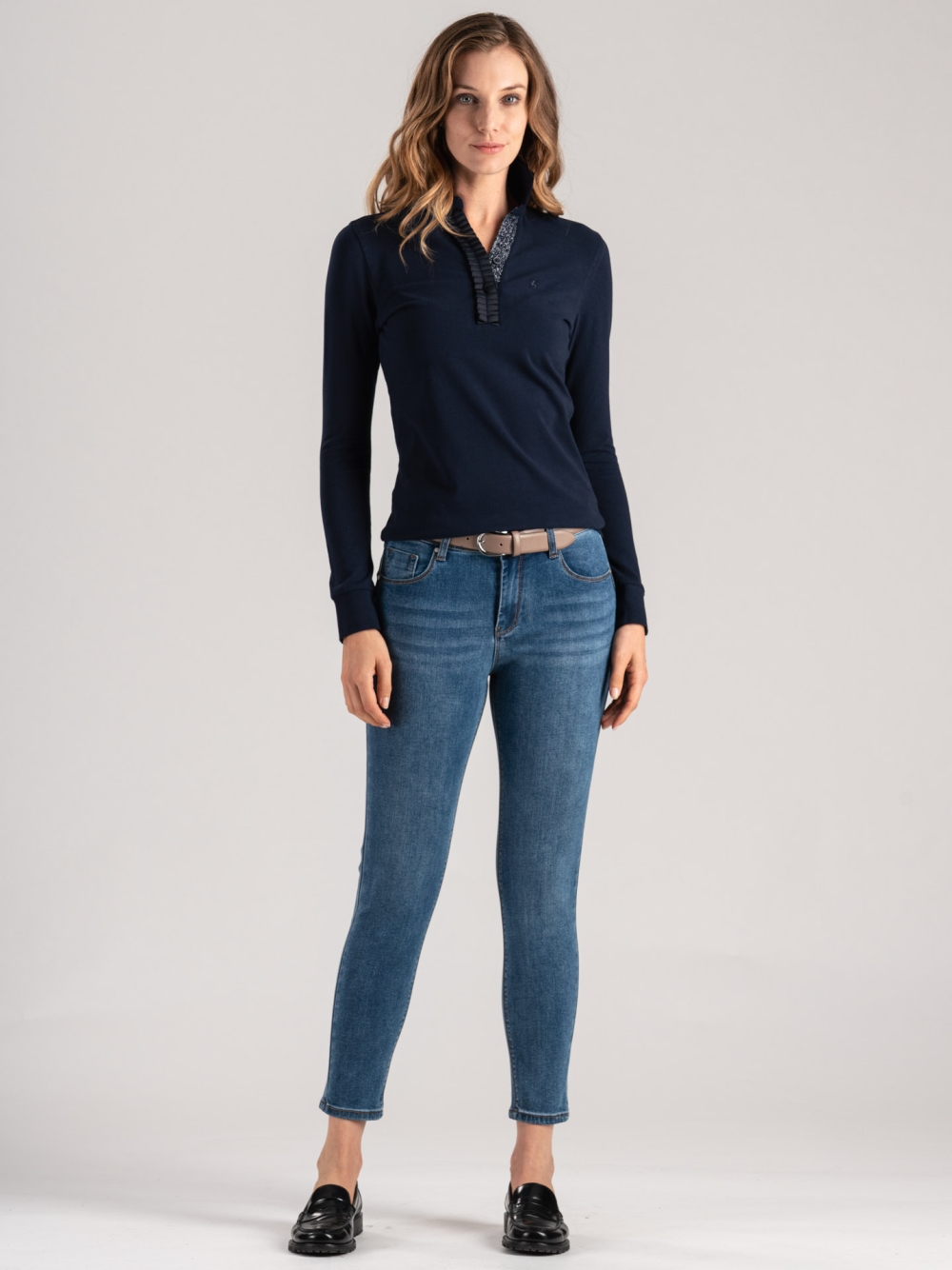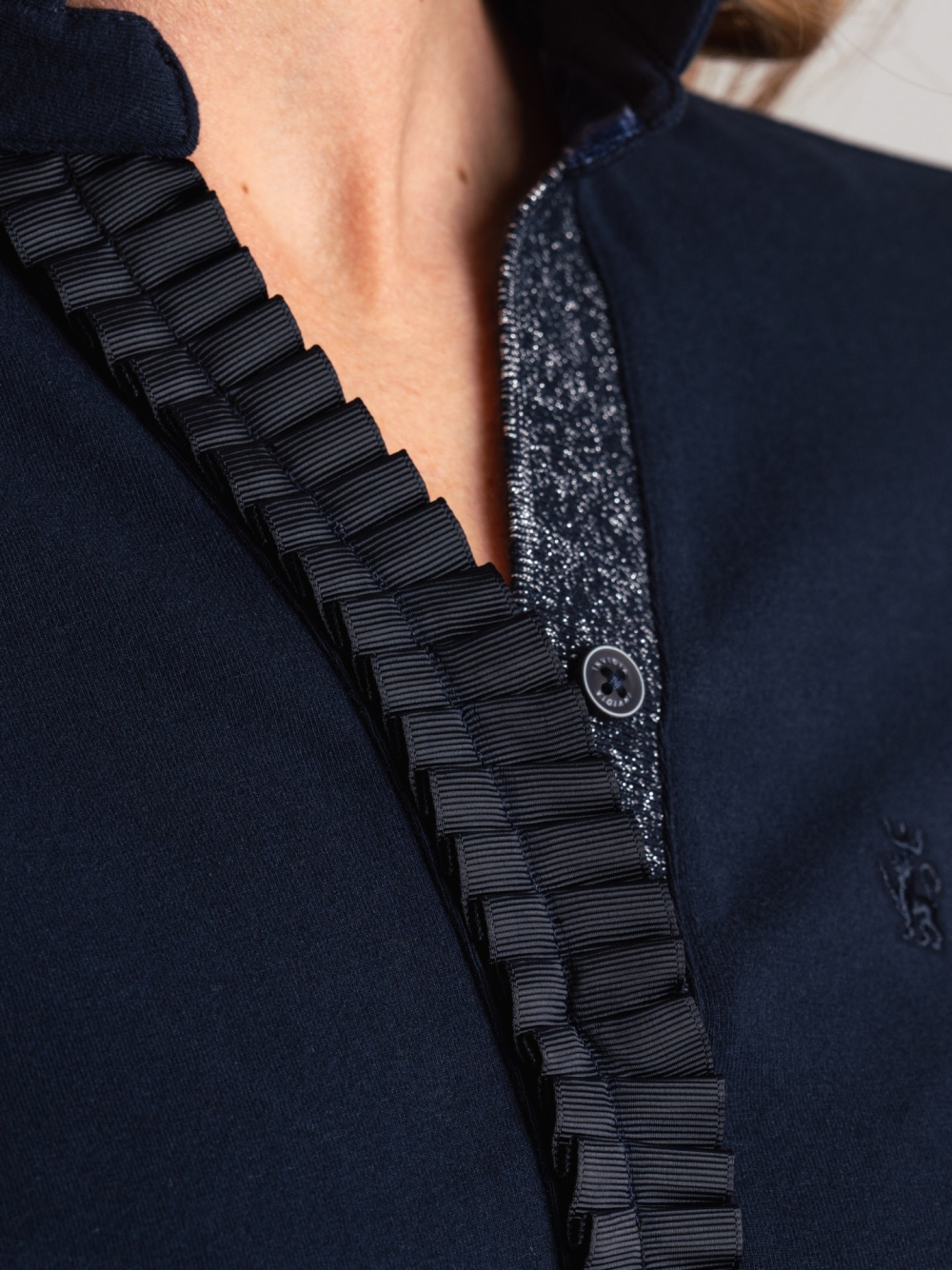 Polo de mujer de punto elástico con volante de grosgrain, aplicación de lúrex y logotipo tono sobre tono.