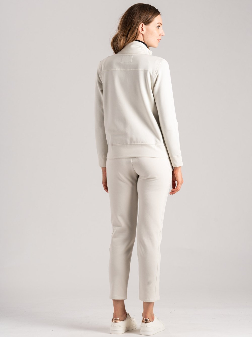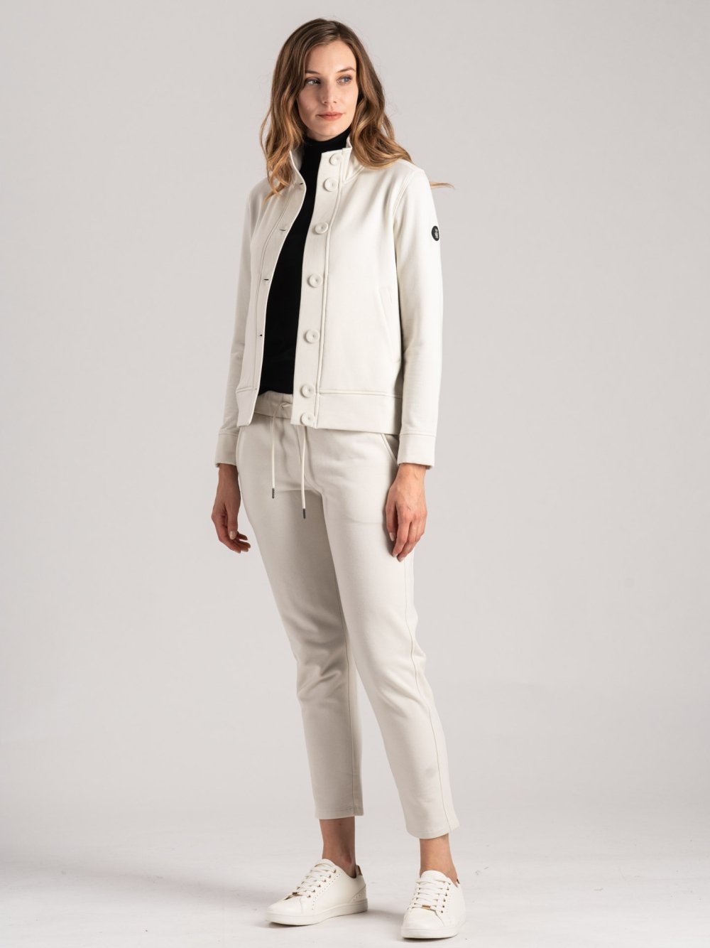 Sudadera de mujer de estilo limpio y elegante, confeccionada en tejido de mano cálido, ideal para entretiempo. El diseño presenta un corte recto, cuello alto y bolsillos verticales. Los grandes botones forrados en tejido tono sobre tono añaden un detalle sofisticado. Disponible en arena y negro, se completa con el logotipo de INVIDIA 1973 engomado en la manga.