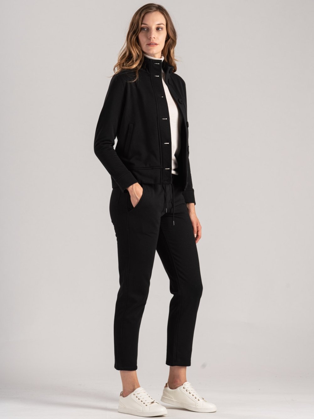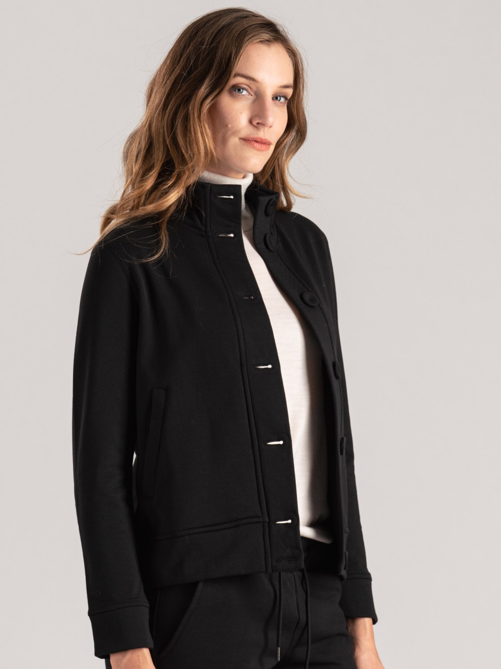 Sudadera de mujer de estilo limpio y elegante, confeccionada en tejido de mano cálido, ideal para entretiempo. El diseño presenta un corte recto, cuello alto y bolsillos verticales. Los grandes botones forrados en tejido tono sobre tono añaden un detalle sofisticado. Disponible en arena y negro, se completa con el logotipo de INVIDIA 1973 engomado en la manga.