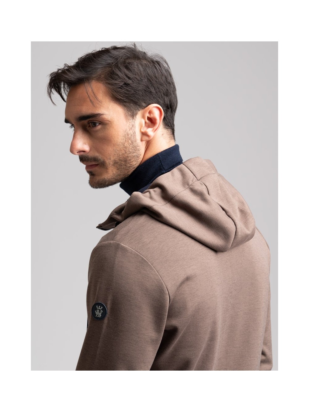 Sudadera de hombre con cremallera completa, capucha con cordón, volante en el bajo en tejido de nido de abeja, bolsillos laterales e interior en contraste. Esta prenda está confeccionada en tejido técnico Scuba en azul y gris paloma. Similar al Jersey, el tejido Scuba es liso y bielástico por un lado, mientras que por el otro tiene un efecto crepé y es conocido y apreciado por su resistencia, elasticidad y comodidad. De hecho, las prendas de felpa INVIDIA 1973 son duraderas y no se estropean en codos y rodillas.