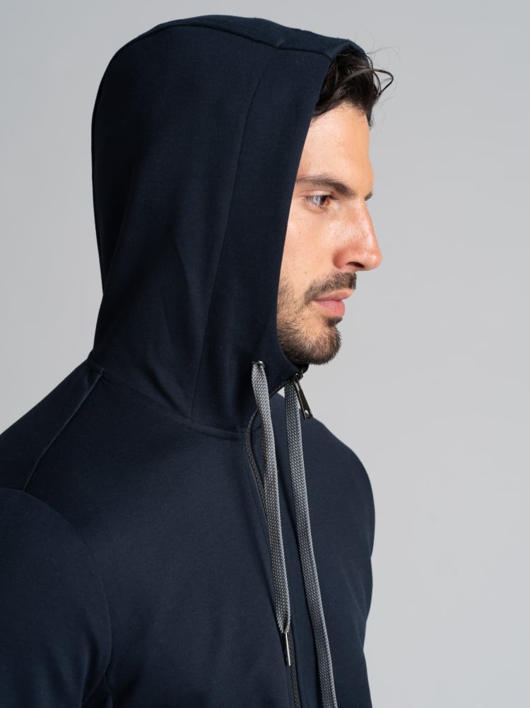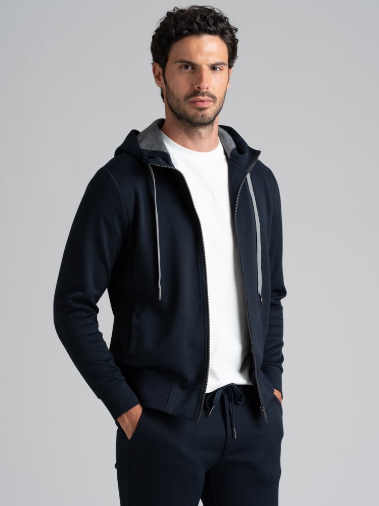 Sudadera de hombre con cremallera completa, capucha con cordón, volante en el bajo en tejido de nido de abeja, bolsillos laterales e interior en contraste. Esta prenda está confeccionada en tejido técnico Scuba en azul y gris paloma. Similar al Jersey, el tejido Scuba es liso y bielástico por un lado, mientras que por el otro tiene un efecto crepé y es conocido y apreciado por su resistencia, elasticidad y comodidad. De hecho, las prendas de felpa INVIDIA 1973 son duraderas y no se estropean en codos y rodillas.