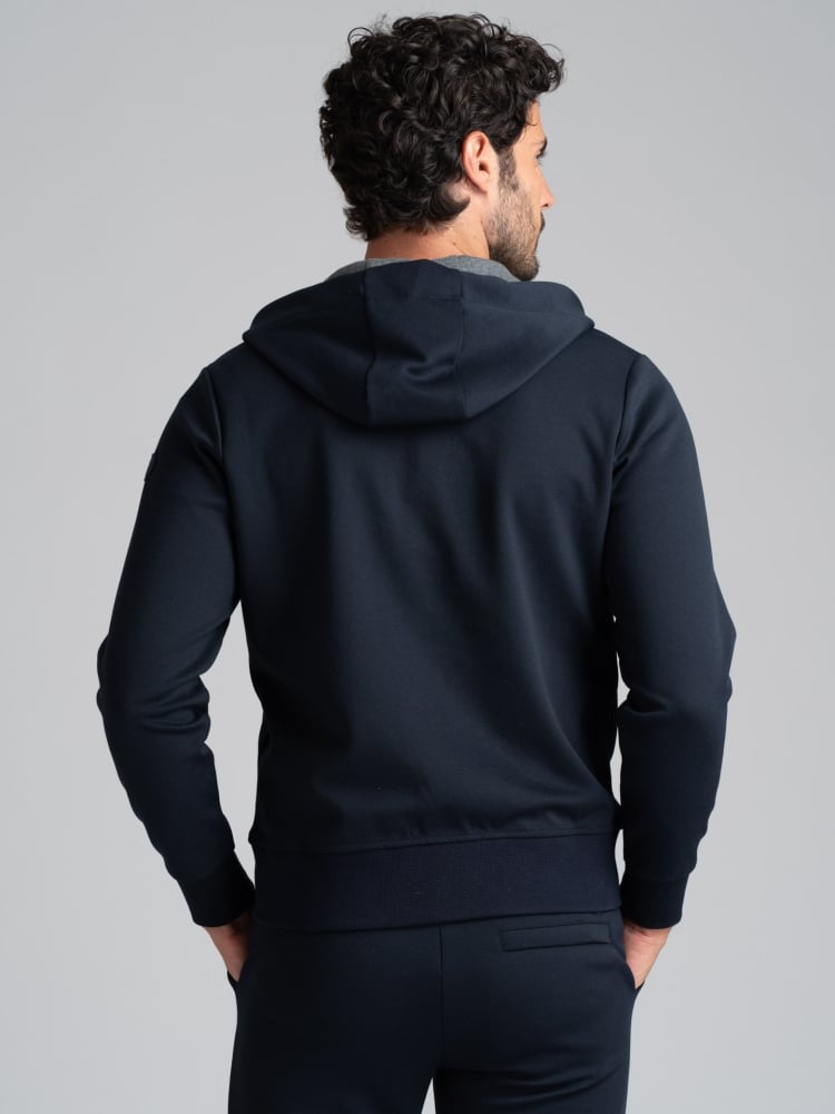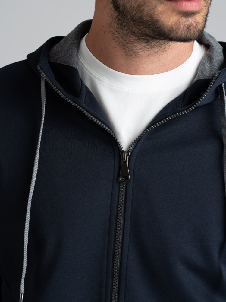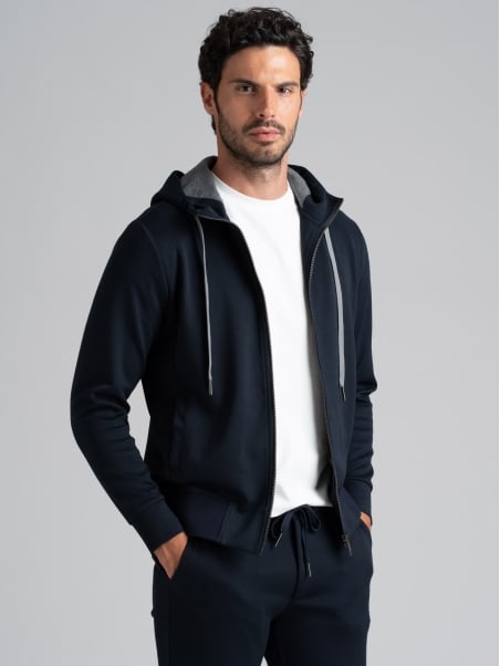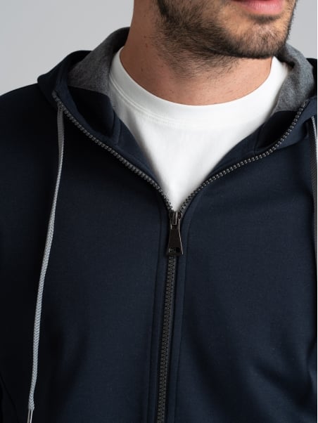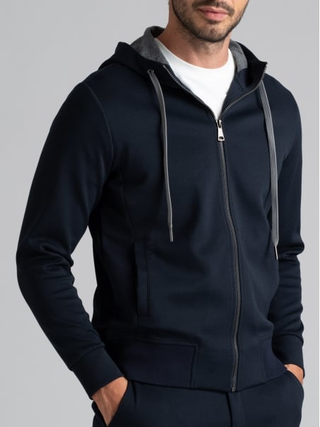 Sudadera de hombre con cremallera completa, capucha, bolsillos, dobladillo inferior en tejido de nido de abeja e interior en contraste, confeccionada en tejido técnico Scuba.