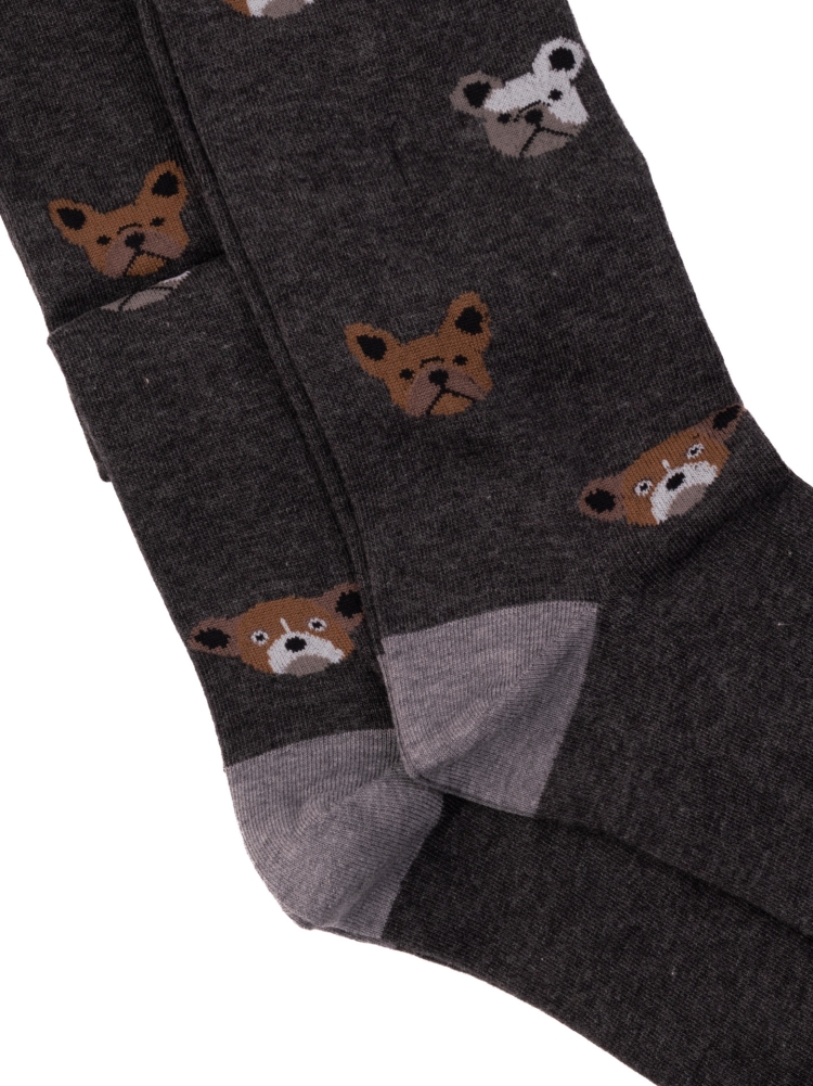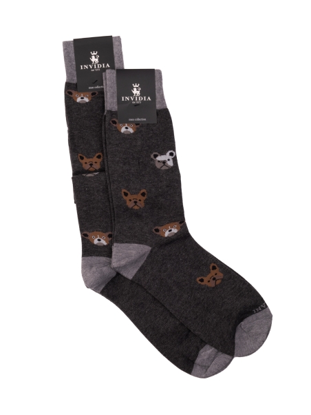 Calze fantasia cagnolini su base blu melange o grigio scuro, dettagli a contrasto in tortora o grigio chiaro.