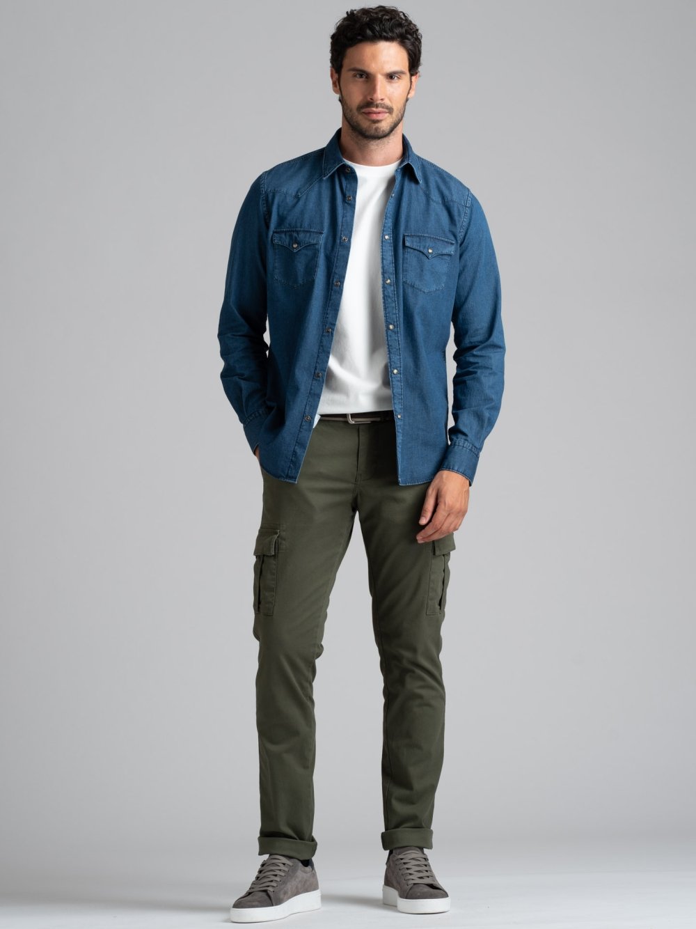 Camicia uomo texana in jeans con collo semifrancese e vestibilità slim, caratterizzata da patelle a punta e bottoni mu automatici.